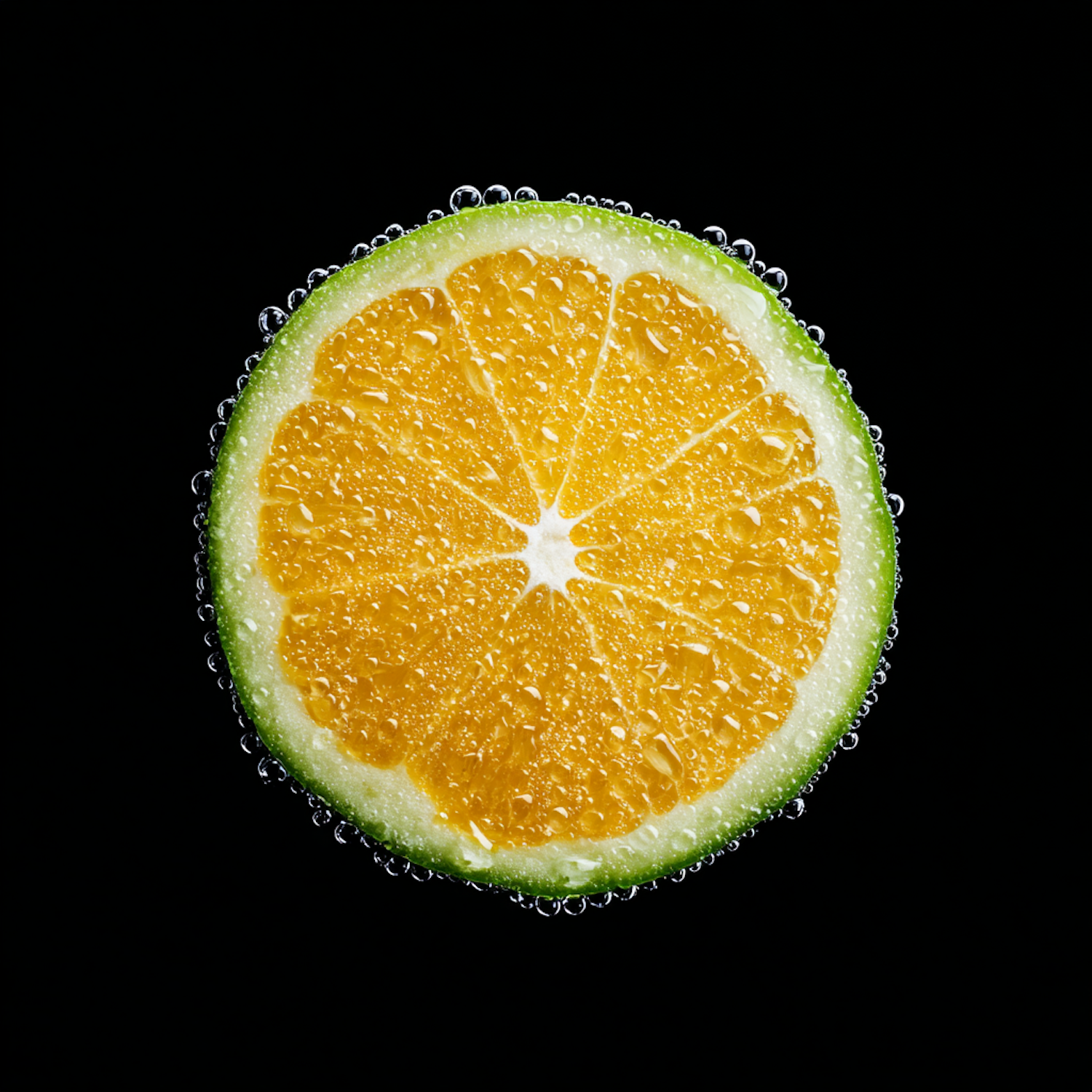 Close-up of a citrus fruit slice with a vibrant orange interior and green rind, covered in water droplets against a black background.