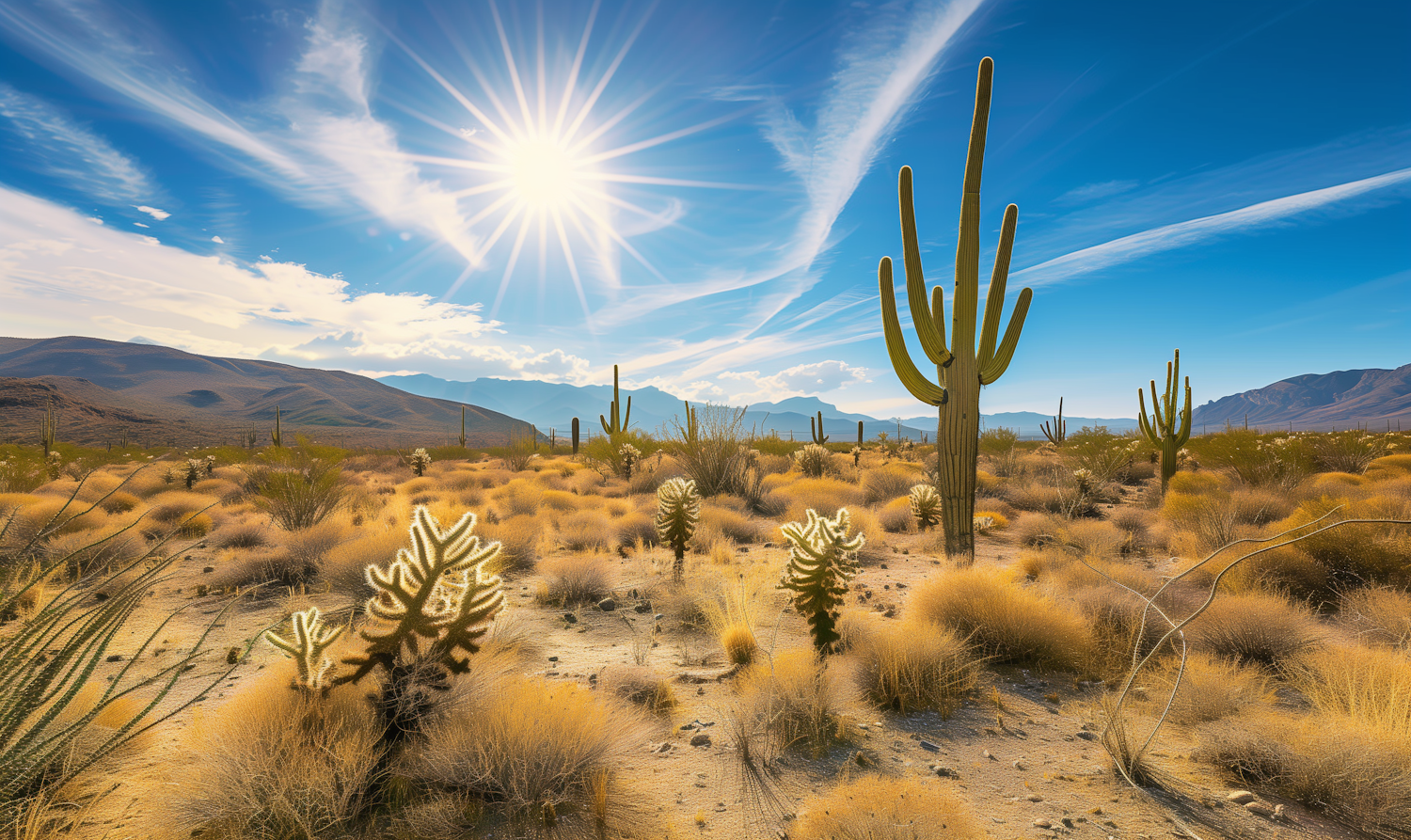 Sunlit desert landscape with tall cacti, golden grasses, and distant mountains under a clear blue sky.