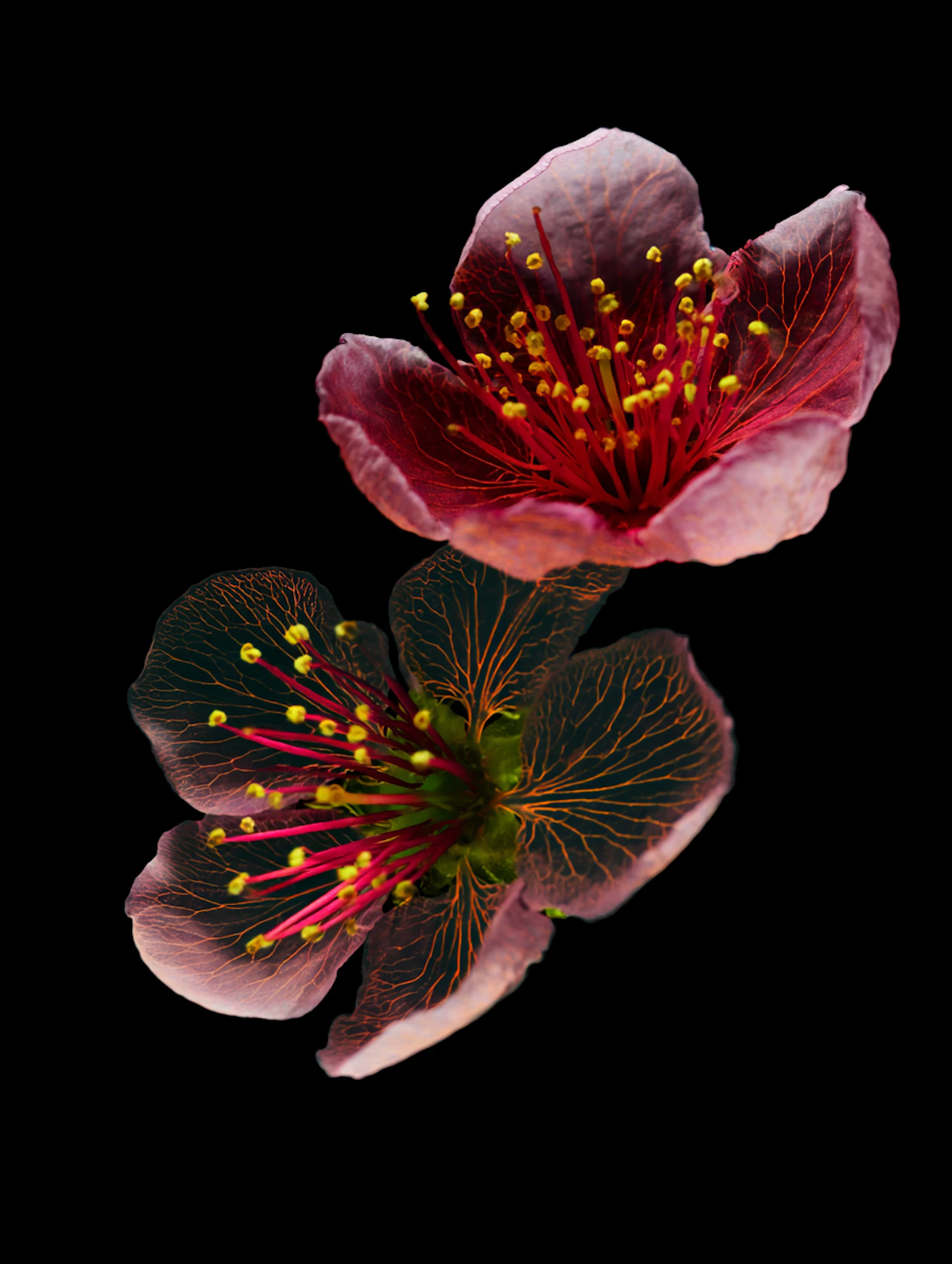 Close-up of two vibrant flowers with intricate petal details and vivid stamen against a black background.