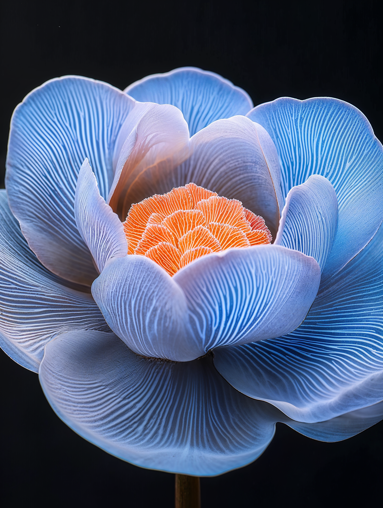 Close-up of a vibrant blue and orange flower with intricate textures, set against a black background for a striking contrast.