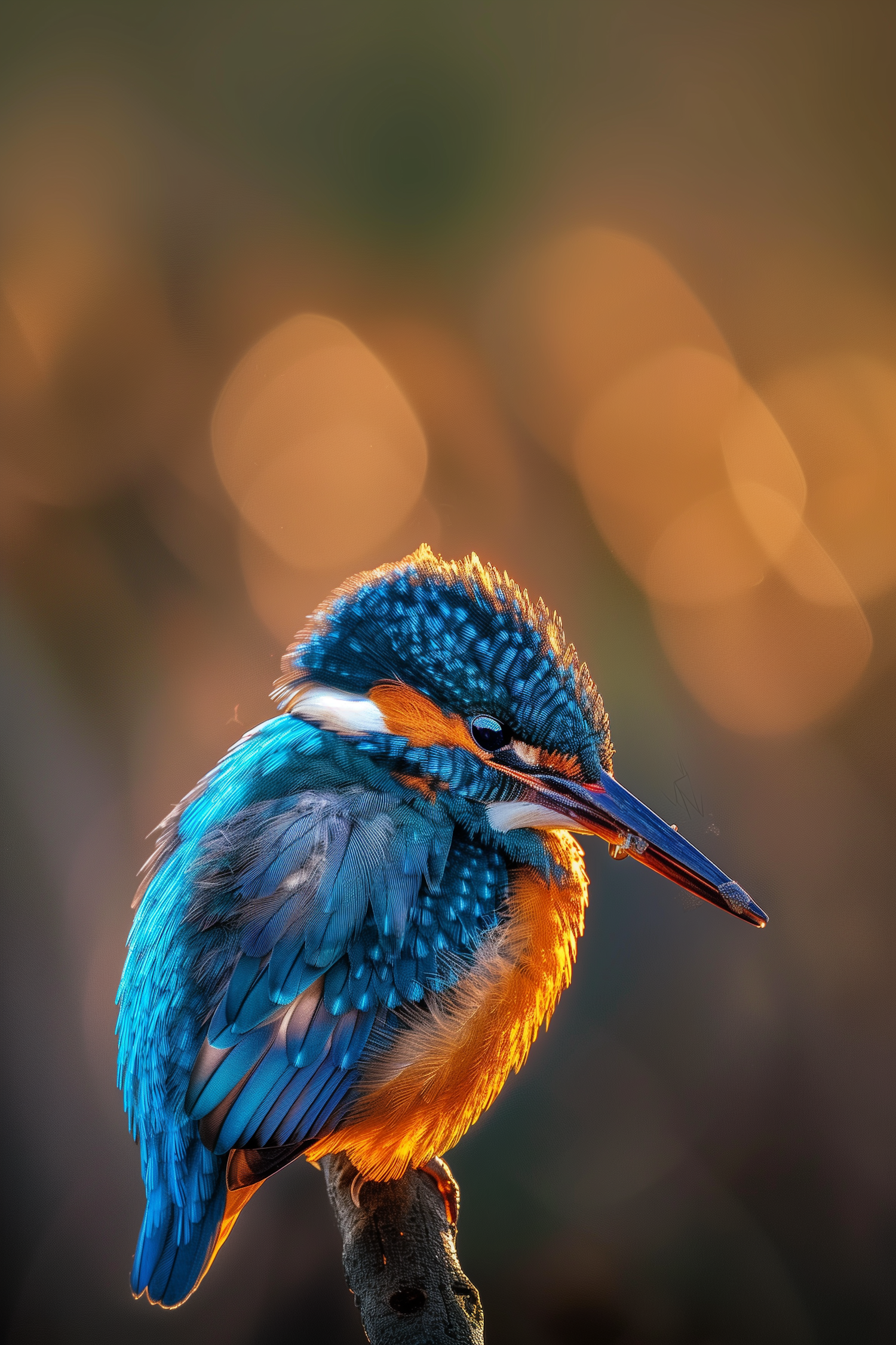Vibrant kingfisher with blue and orange plumage perched on a branch, set against a warm, golden bokeh background.