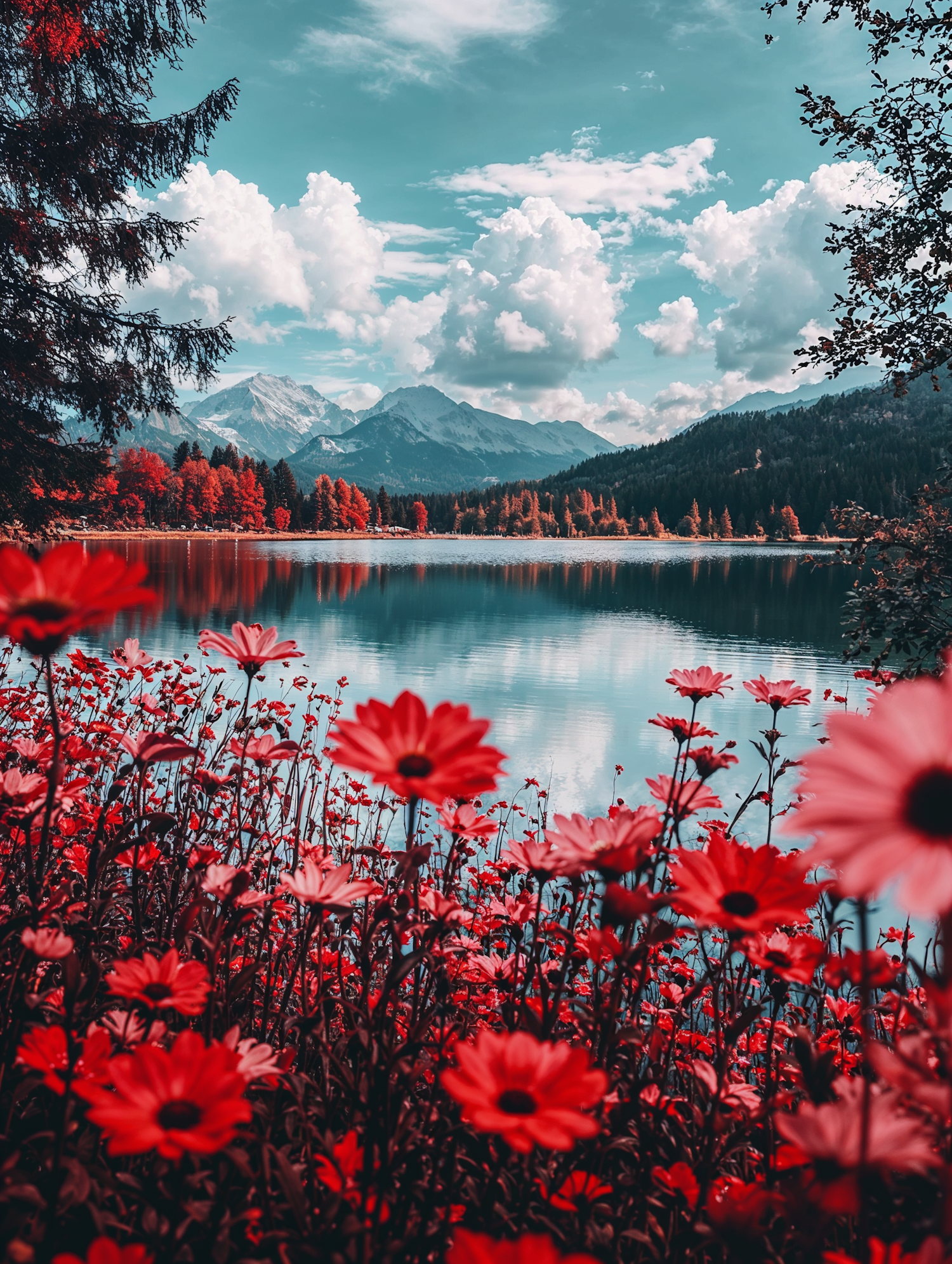 A surreal lakeside view with vivid red flowers, turquoise water, and majestic mountains under a bright blue sky with fluffy clouds.