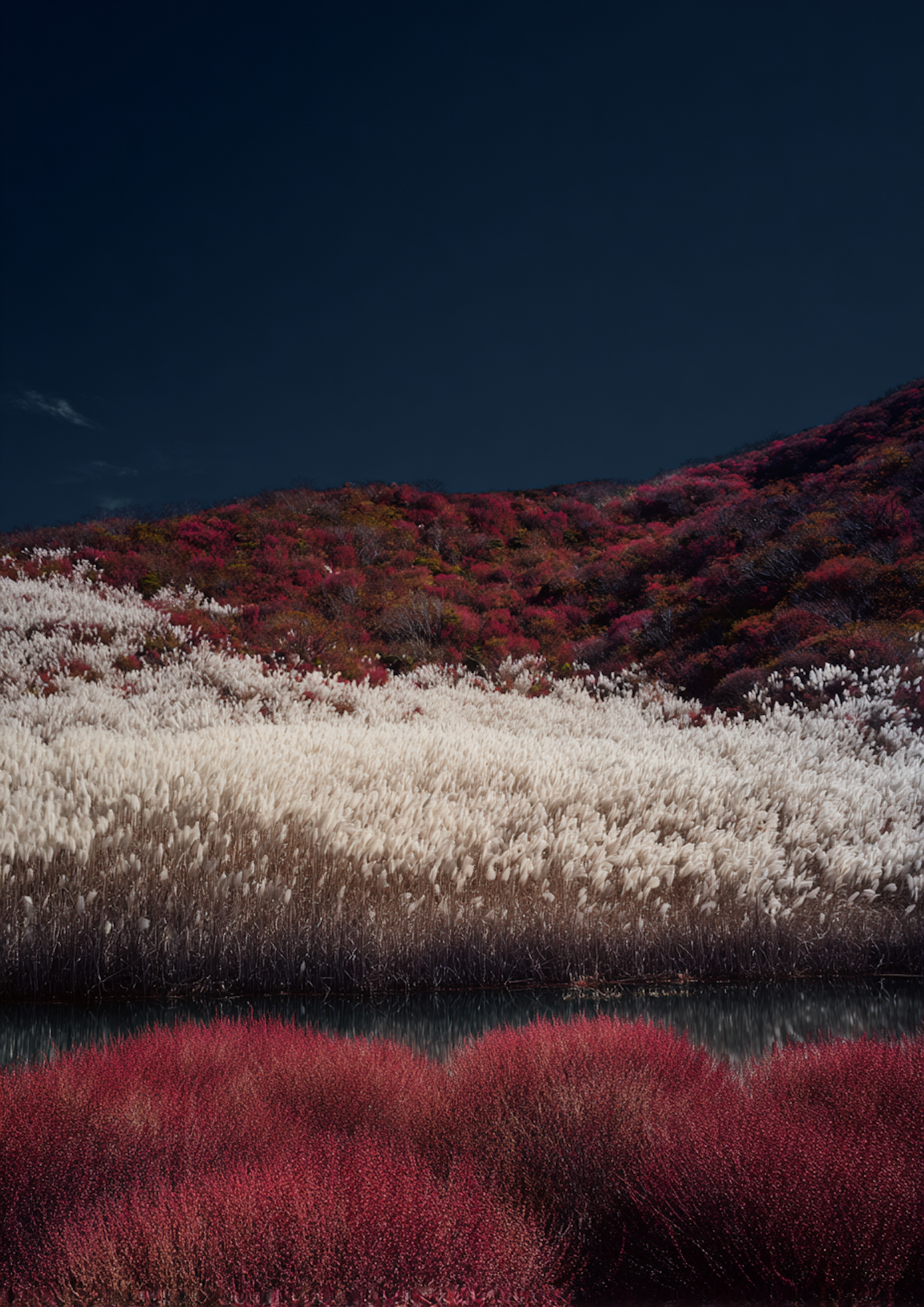 A vibrant landscape of red bushes, white grass, and a colorful hillside under a deep blue sky, creating a striking natural scene.