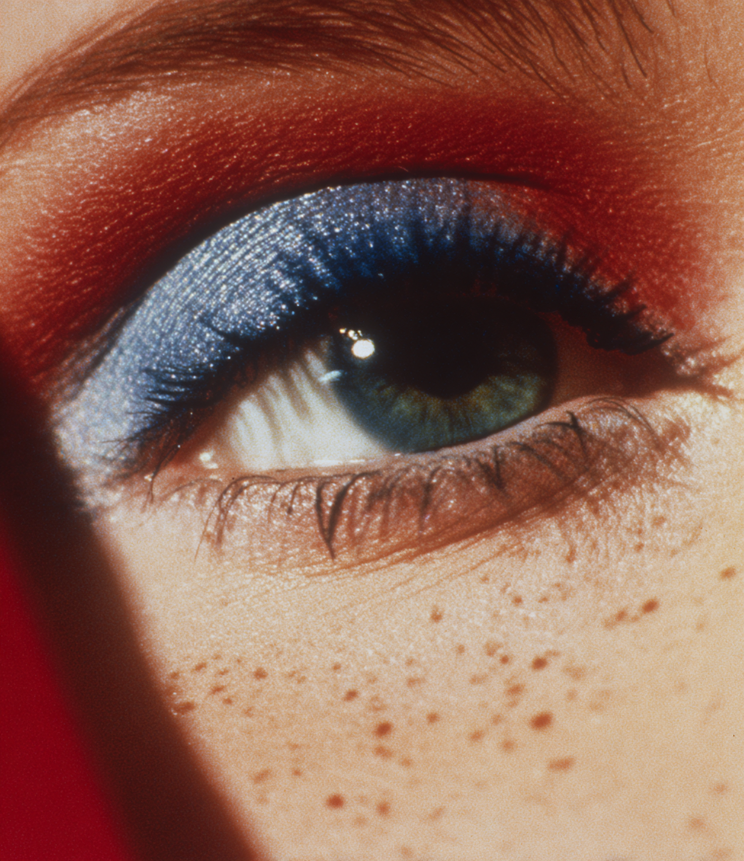 A close-up view of a green eye accented with bold red and blue makeup, showing detailed texture and color of the skin and eyeshadow.