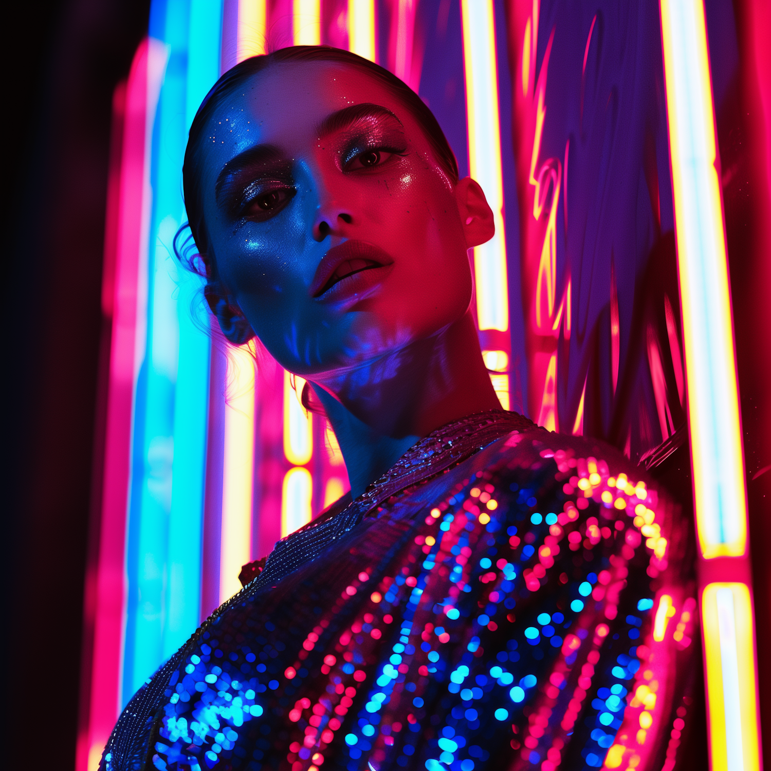 Woman in sequined outfit illuminated by vibrant neon lights, creating a futuristic and dazzling effect with bold makeup and slicked-back hair.