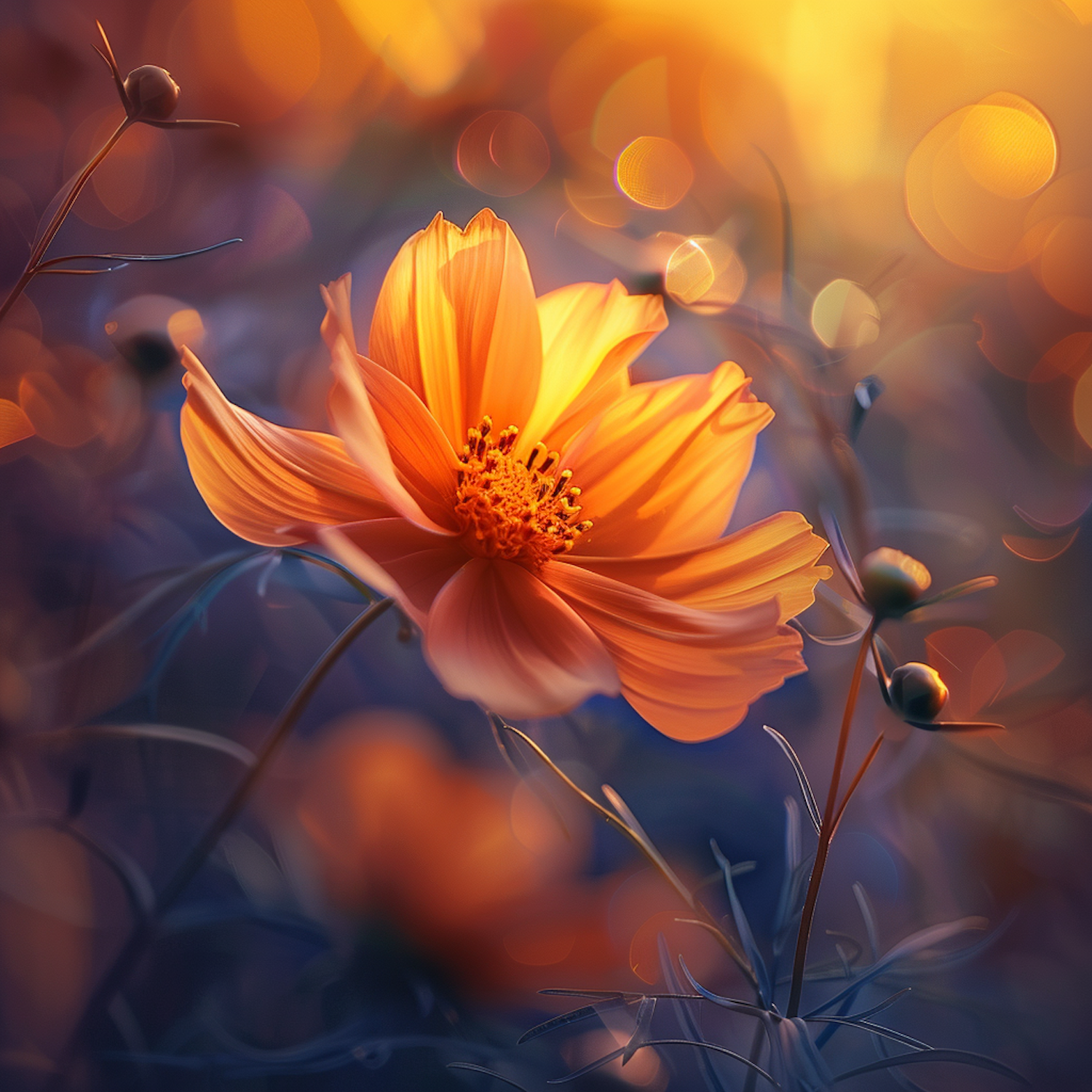 A vibrant orange flower in full bloom against a dreamy, blurred background with soft bokeh effects and contrasting colors.