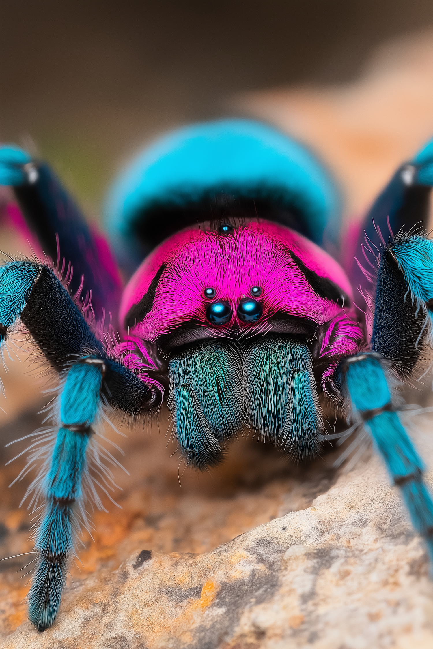 Vivid close-up of a pink and blue tarantula with intricate details, perched on a textured surface. Perfect for nature and macro photography lovers.