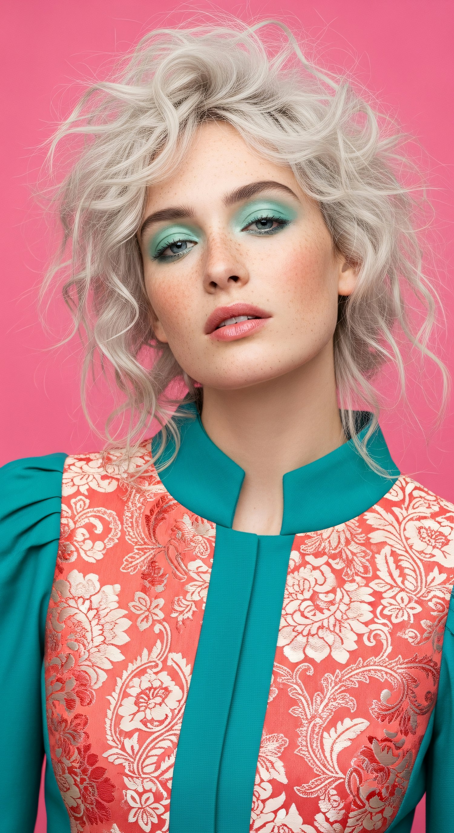 A vibrant portrait showing a stylish individual with pale wavy hair, teal makeup, and a bold, patterned outfit against a pink backdrop.