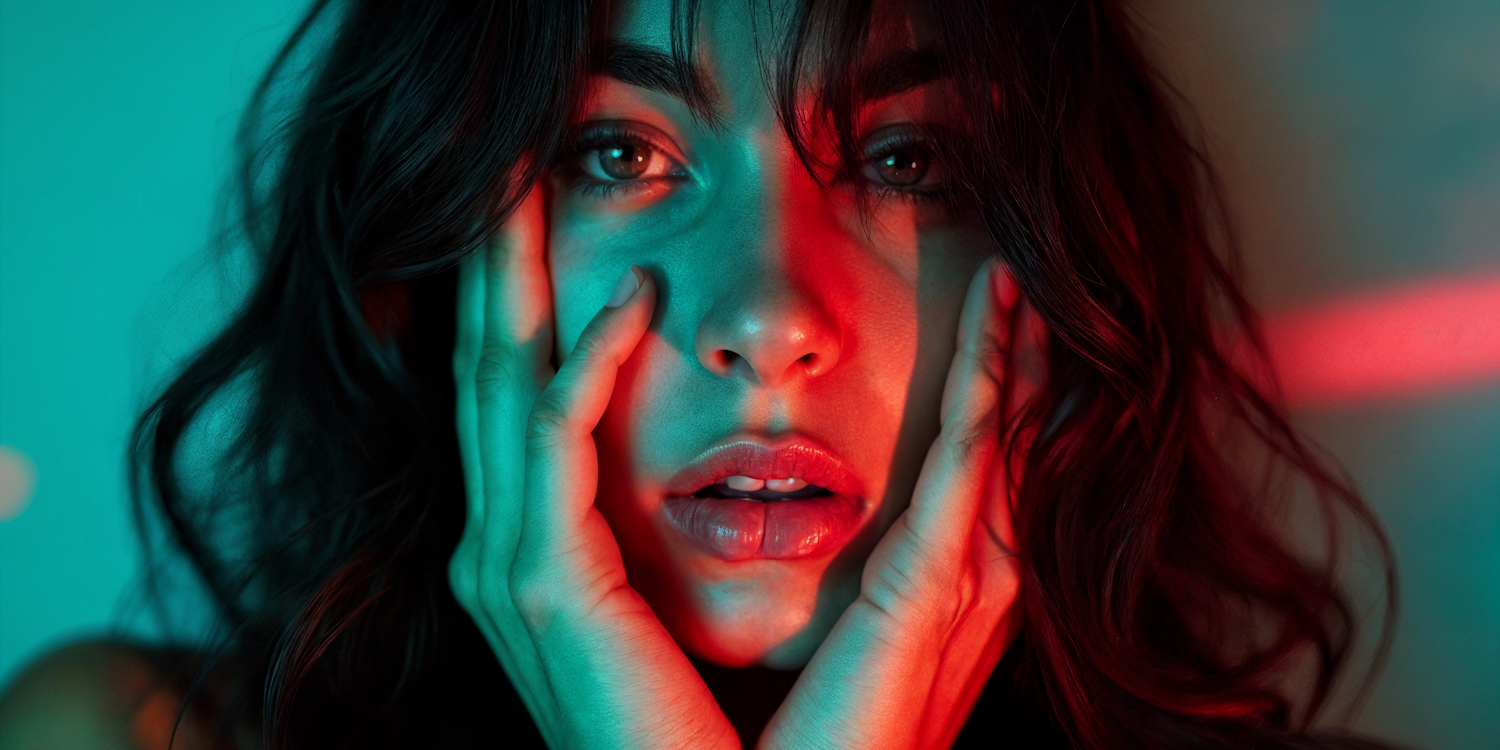 A close-up portrait with dramatic red and teal lighting, highlighting expressive features and creating a striking visual effect.