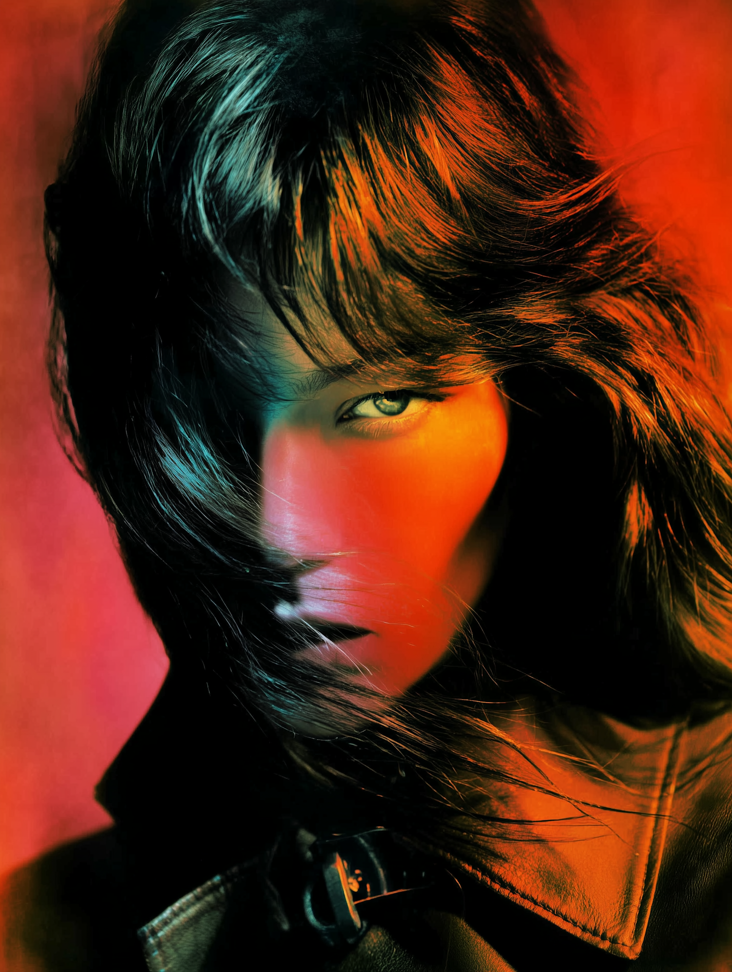 A dramatic portrait with vibrant lighting, featuring a person with dark hair and intense gaze, creating a bold and artistic composition.