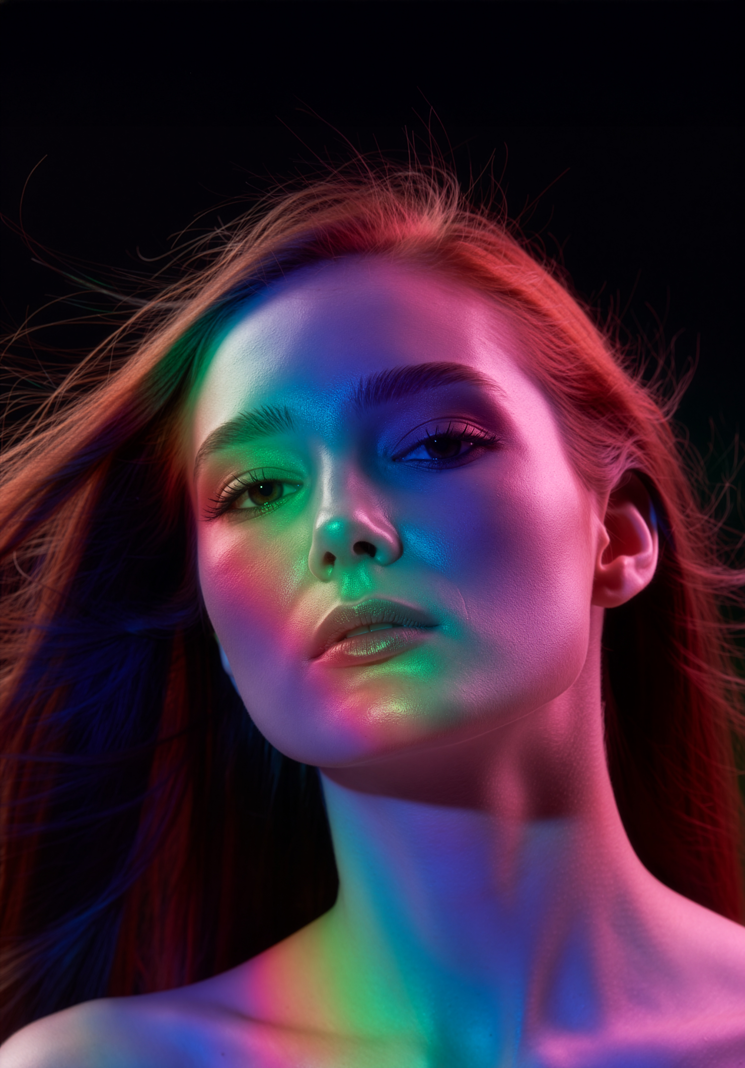 A vibrant portrait of a woman with colorful lighting on her face, creating a dynamic and artistic visual effect.