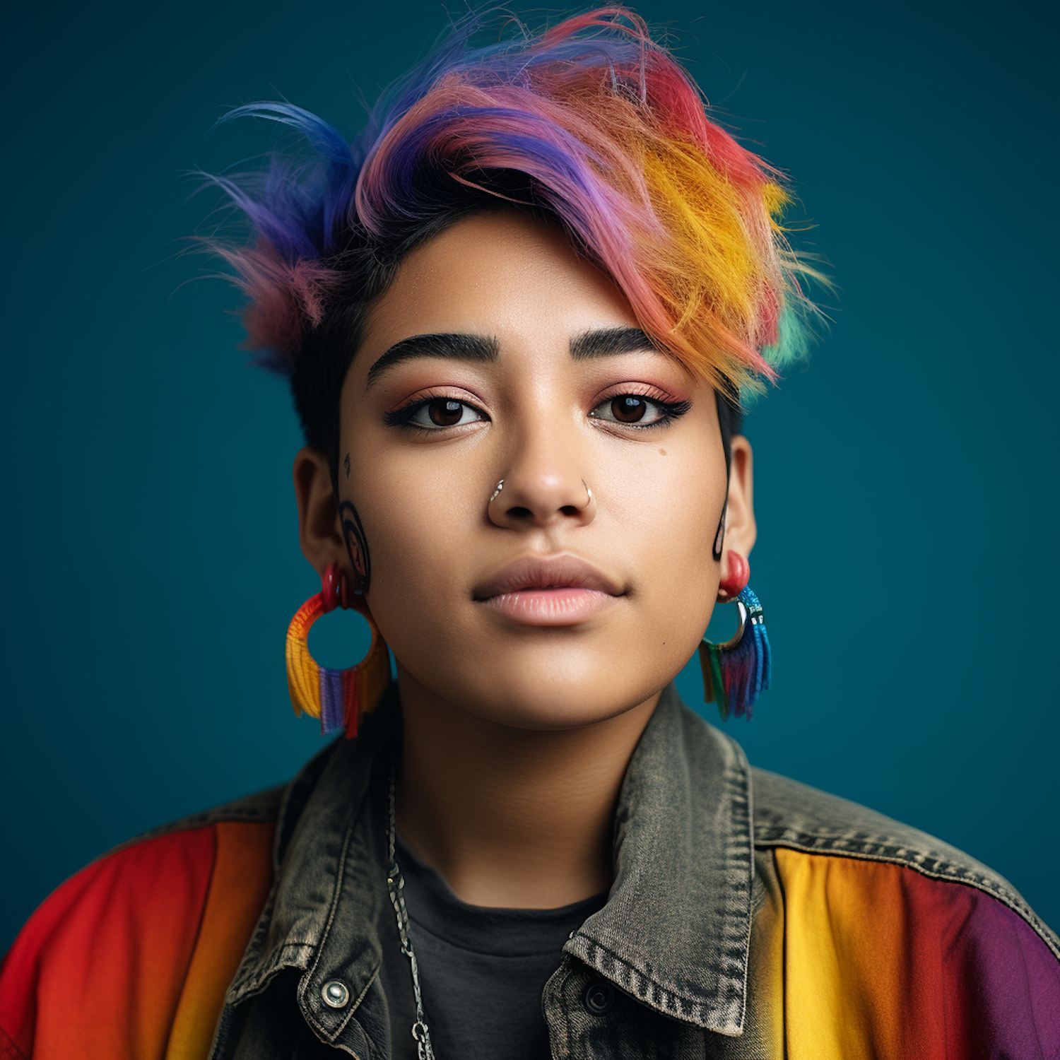 Vibrant portrait of a person with multicolored hair, rainbow earrings, and a denim jacket against a teal background.