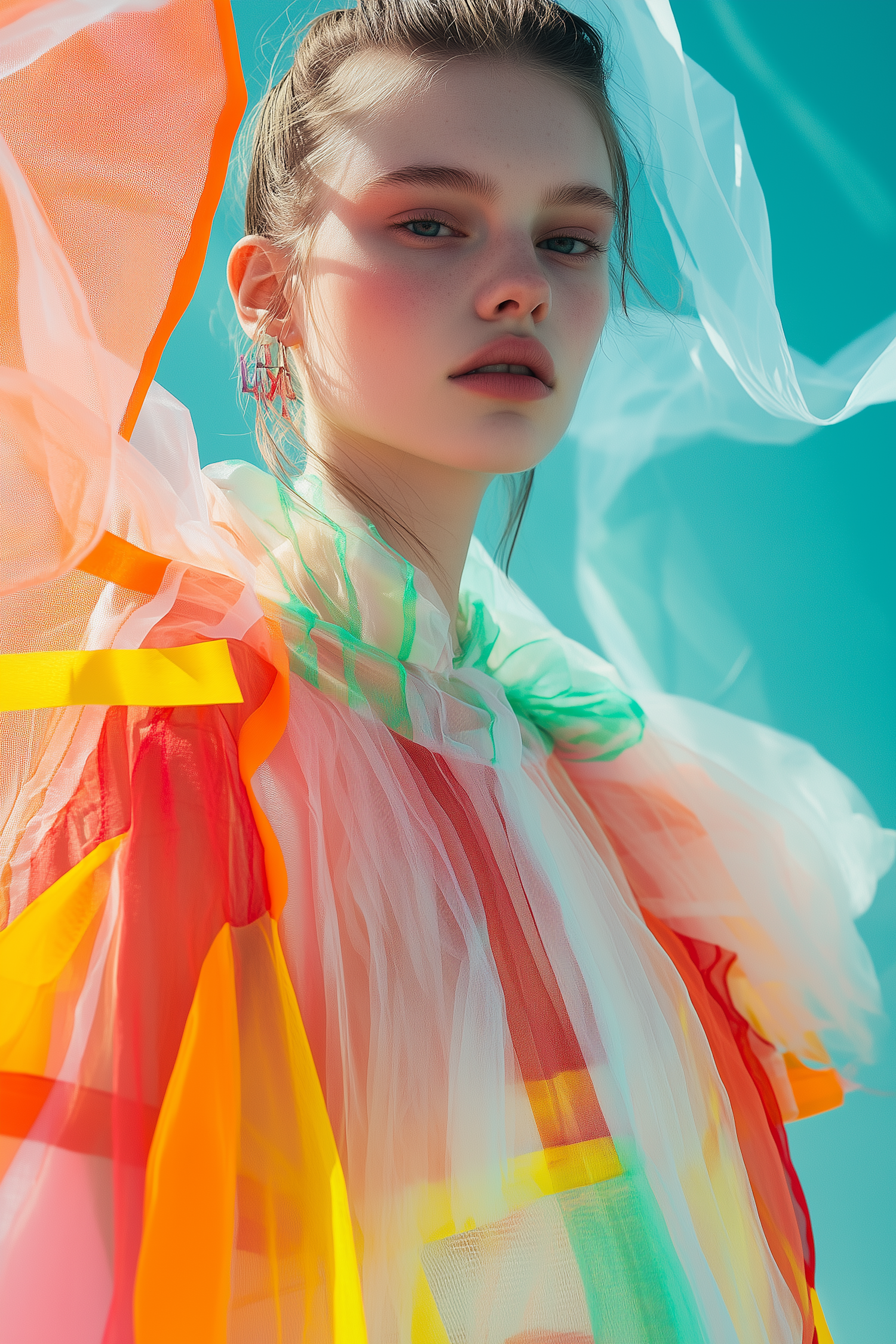 A young woman in a colorful sheer outfit against a turquoise background, showcasing vibrant fashion and minimalistic beauty.
