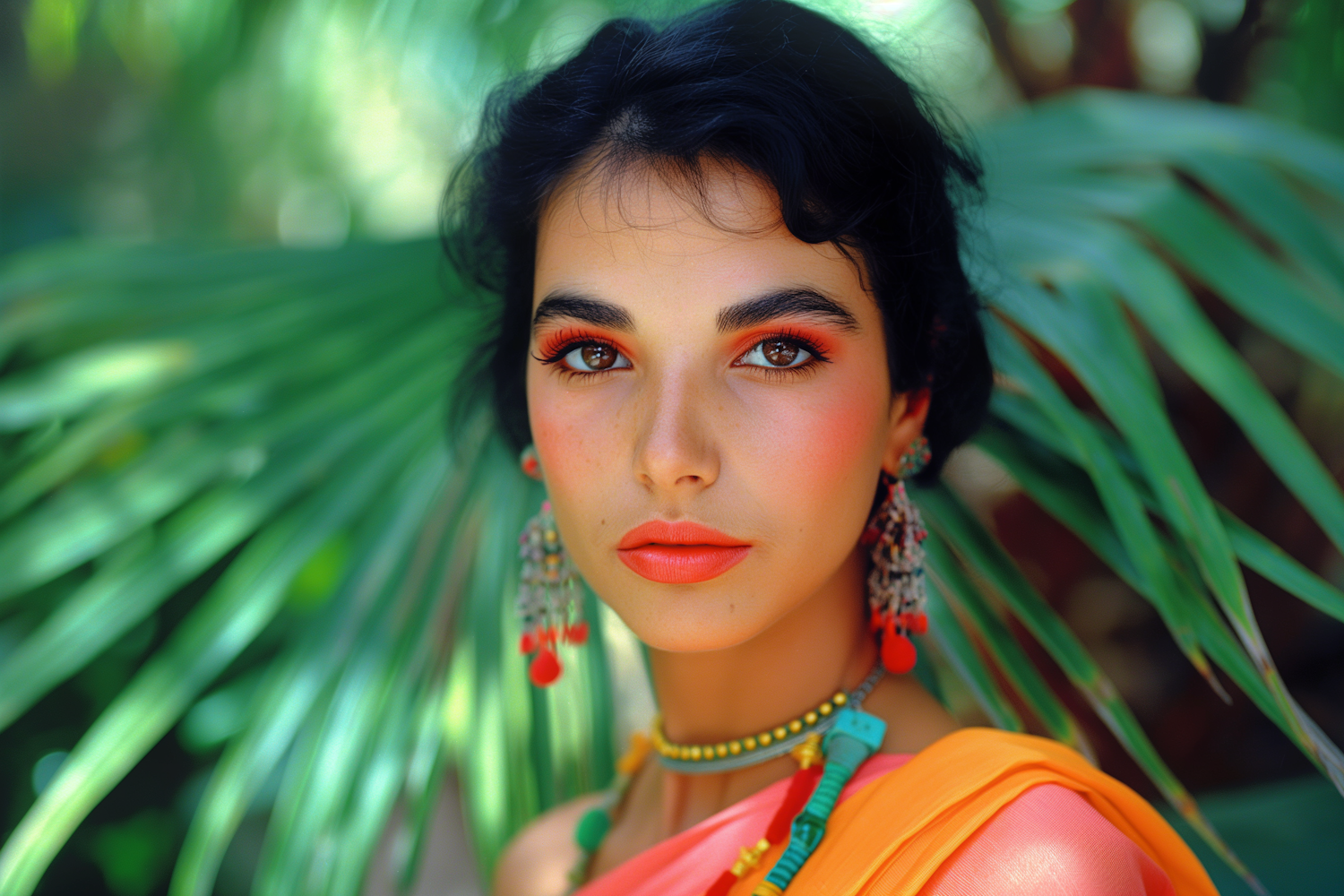A woman with bold makeup and colorful attire stands against lush green leaves, exuding confidence and elegance.