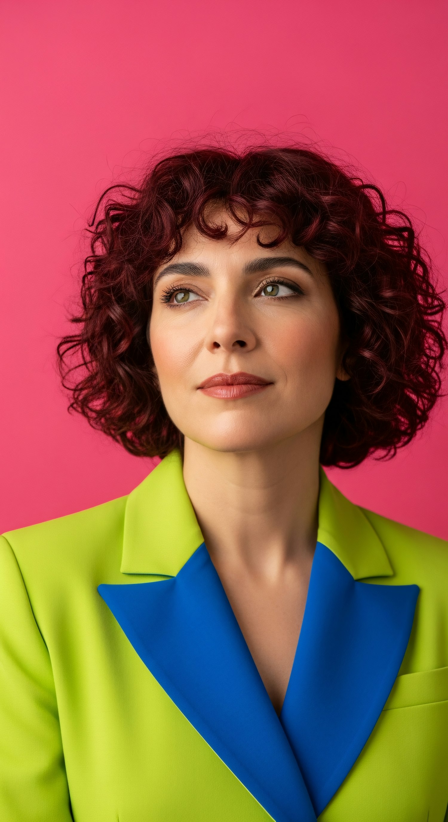 A person with curly red hair wearing a lime green blazer with a blue lapel stands against a bright pink background.