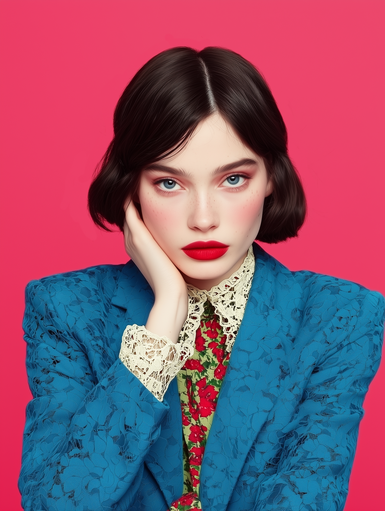 Stylish woman with blue eyes and red lipstick in a blue lace blazer against a pink background, exuding vintage elegance.