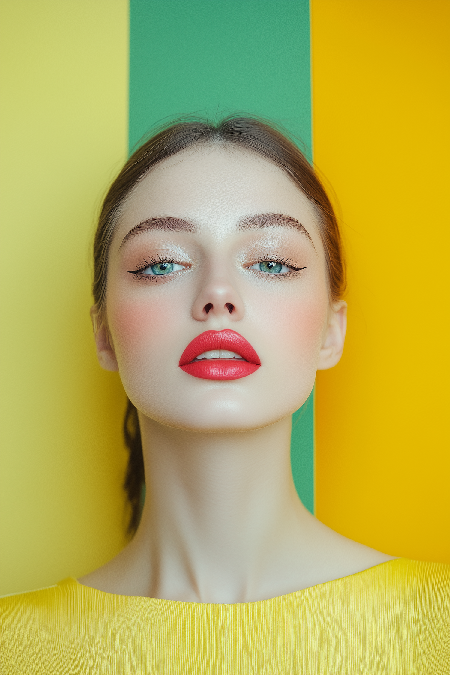 Portrait of a woman with red lips and blue eyes against a vibrant yellow, green, and orange background.