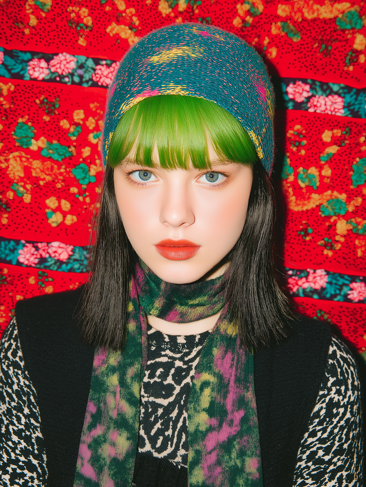 A vibrant portrait of a person with green hair, blue eyes, and colorful attire against a bold red floral background.