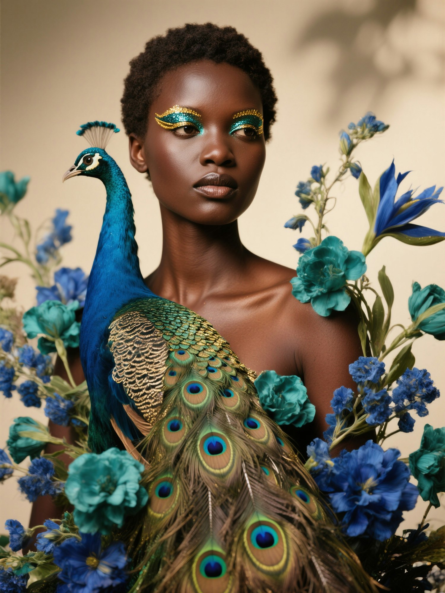 high fashion editorial portrait of a woman, perfect glossy skin, warm soft lighting, rich floral composition, detailed textures, vibrant colors, high-end studio photography, cinematic ambiance, 85mm lens, an East African woman with deep brown skin, short textured hair, gold eyeliner and teal shimmer, surrounded by peacock feathers and exotic blue-green florals, a peacock tail flowing around her shoulders, rich duck blue and gold color palette