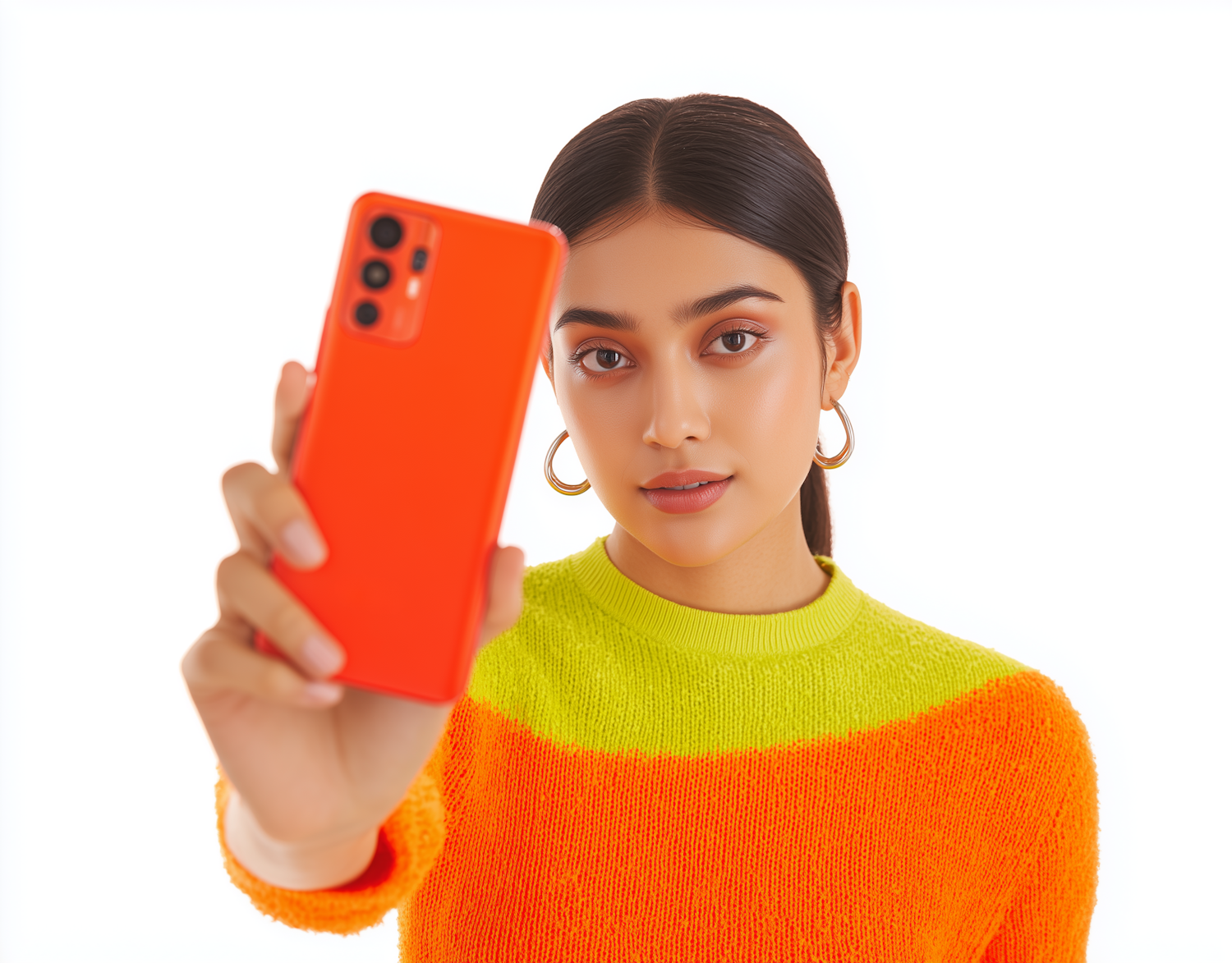 A young woman in a vibrant sweater holds an orange smartphone, set against a clean white background, showcasing modern style.