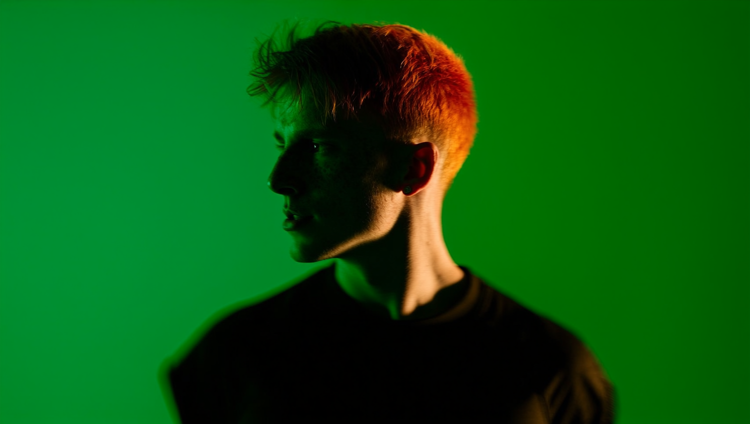 A striking portrait of a person with red hair against a vivid green background, showcasing dramatic lighting and bold contrasts.