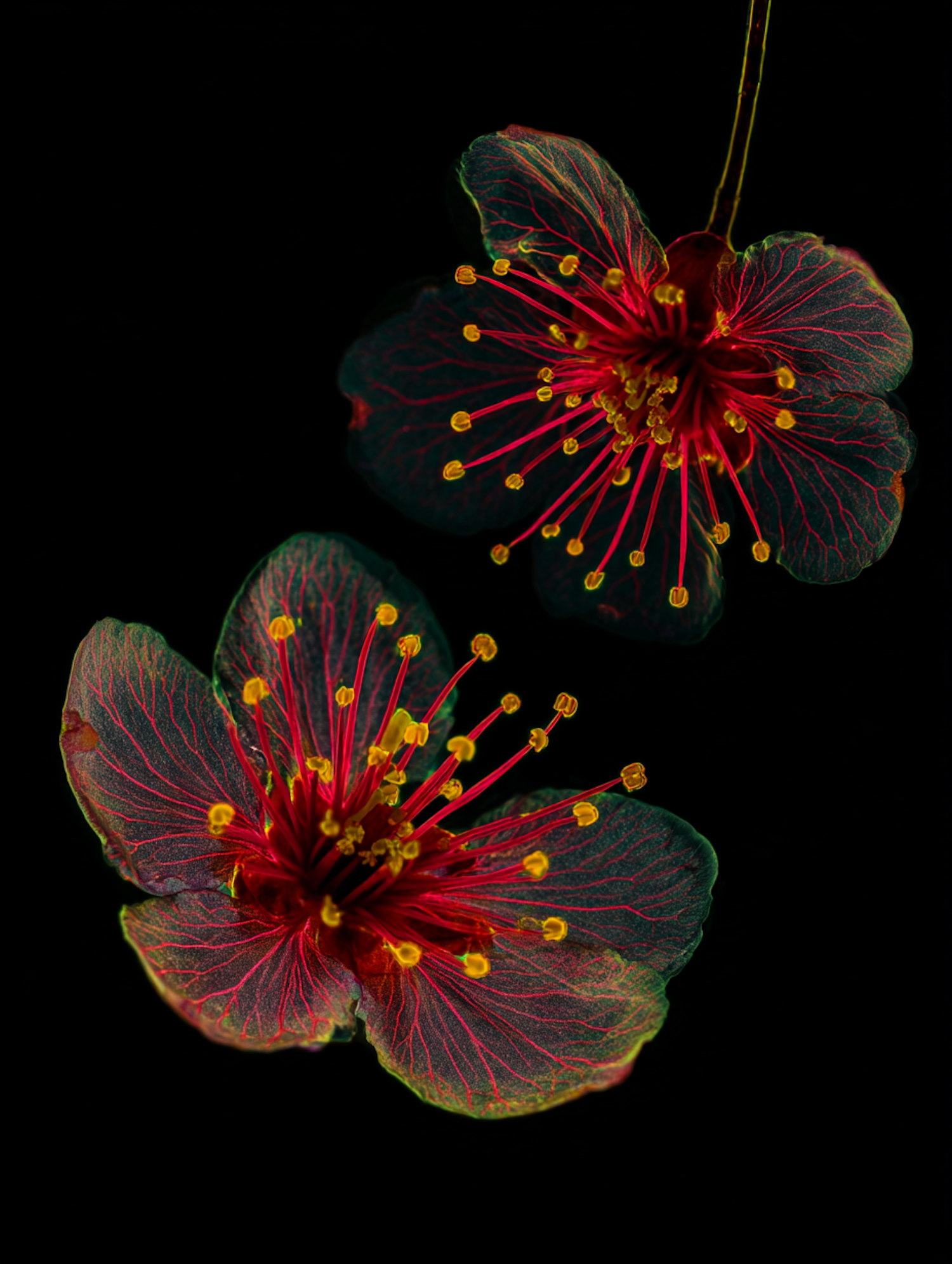 Close-up of two vibrant flowers with red petals and yellow stamens on a black background, showcasing intricate details and vivid colors.