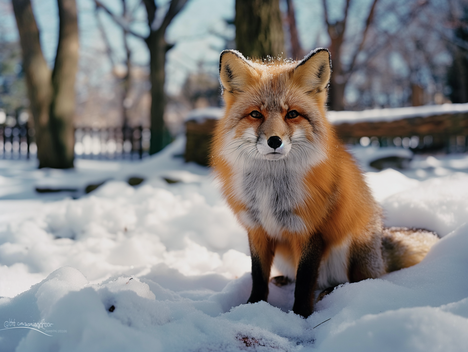 A red fox sits on snow in a winter forest, its vibrant fur contrasting with the white surroundings under soft sunlight.