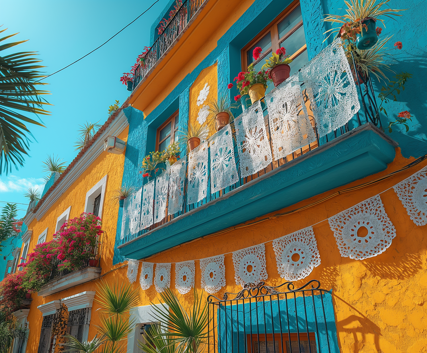 Vibrant yellow and turquoise building with lace decorations and potted flowers, set against a clear blue sky.