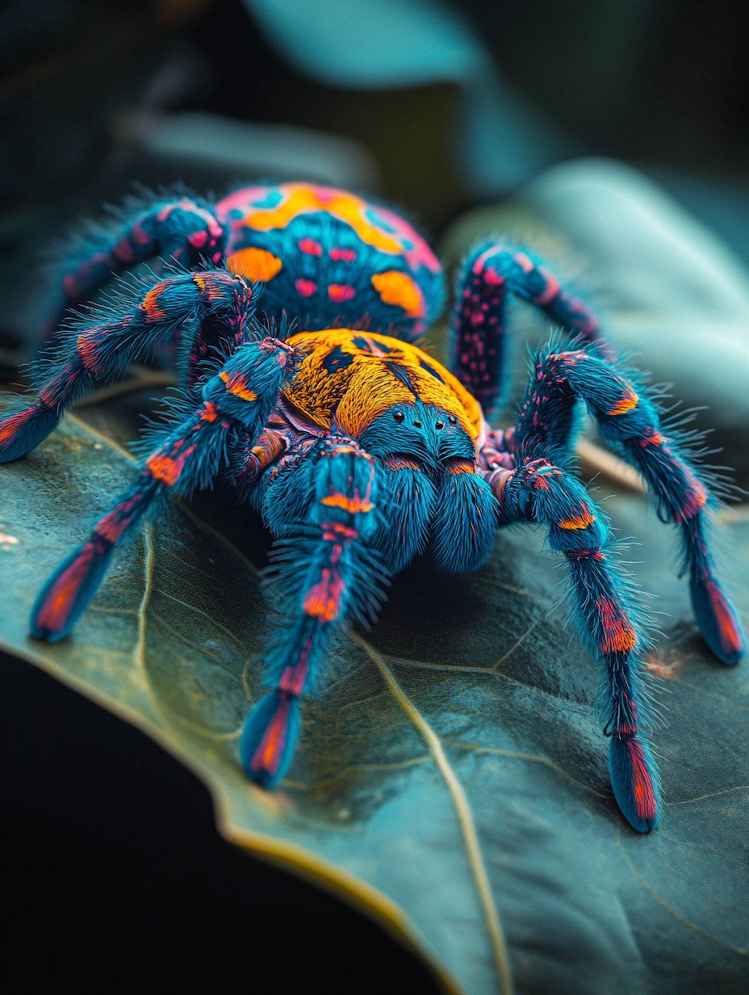 A vibrant tarantula with blue, orange, and yellow hues rests on a green leaf, showcasing intricate patterns and fine colorful hairs.