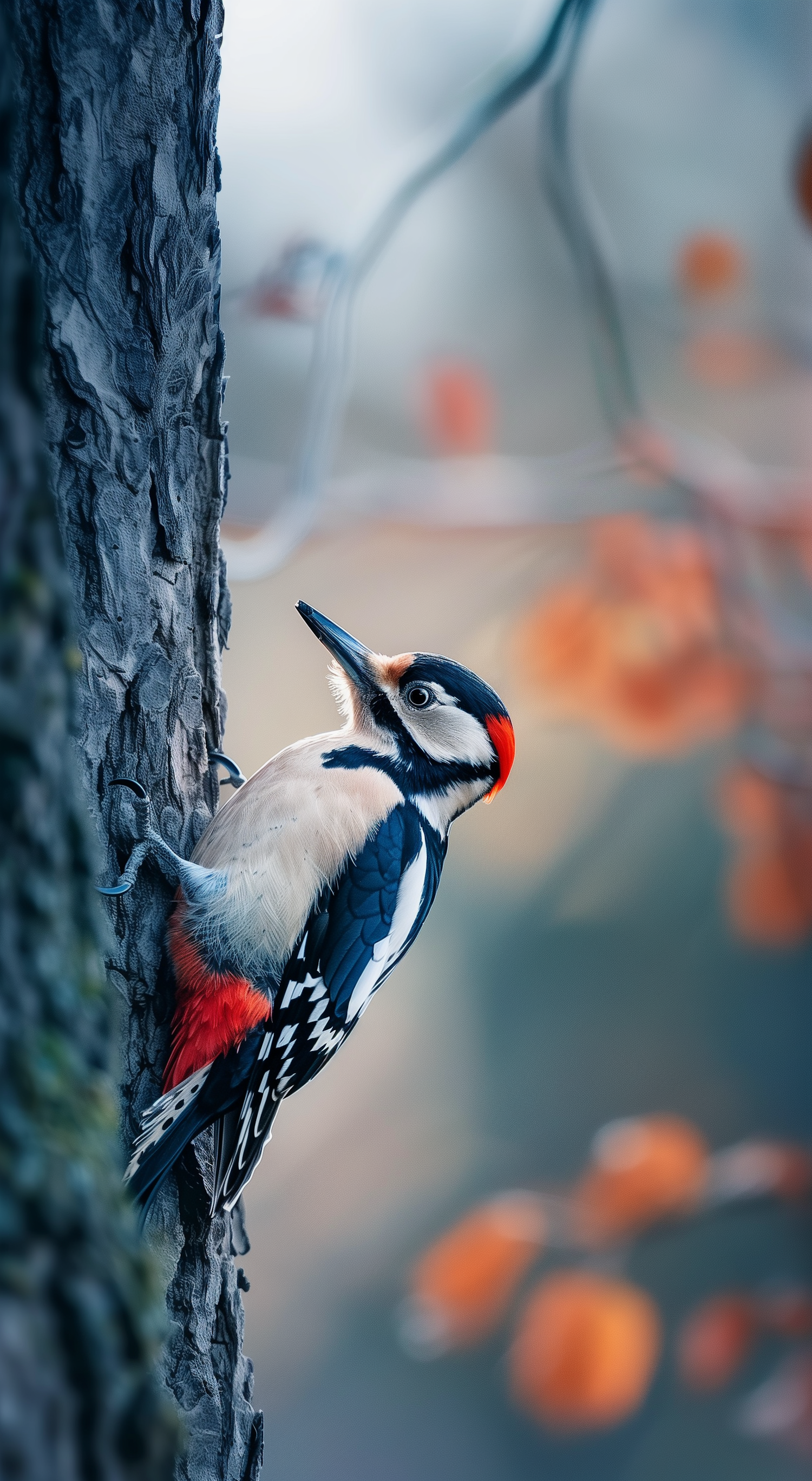 Vibrant woodpecker on a tree trunk with striking black, white, and red plumage against a blurred natural background.
