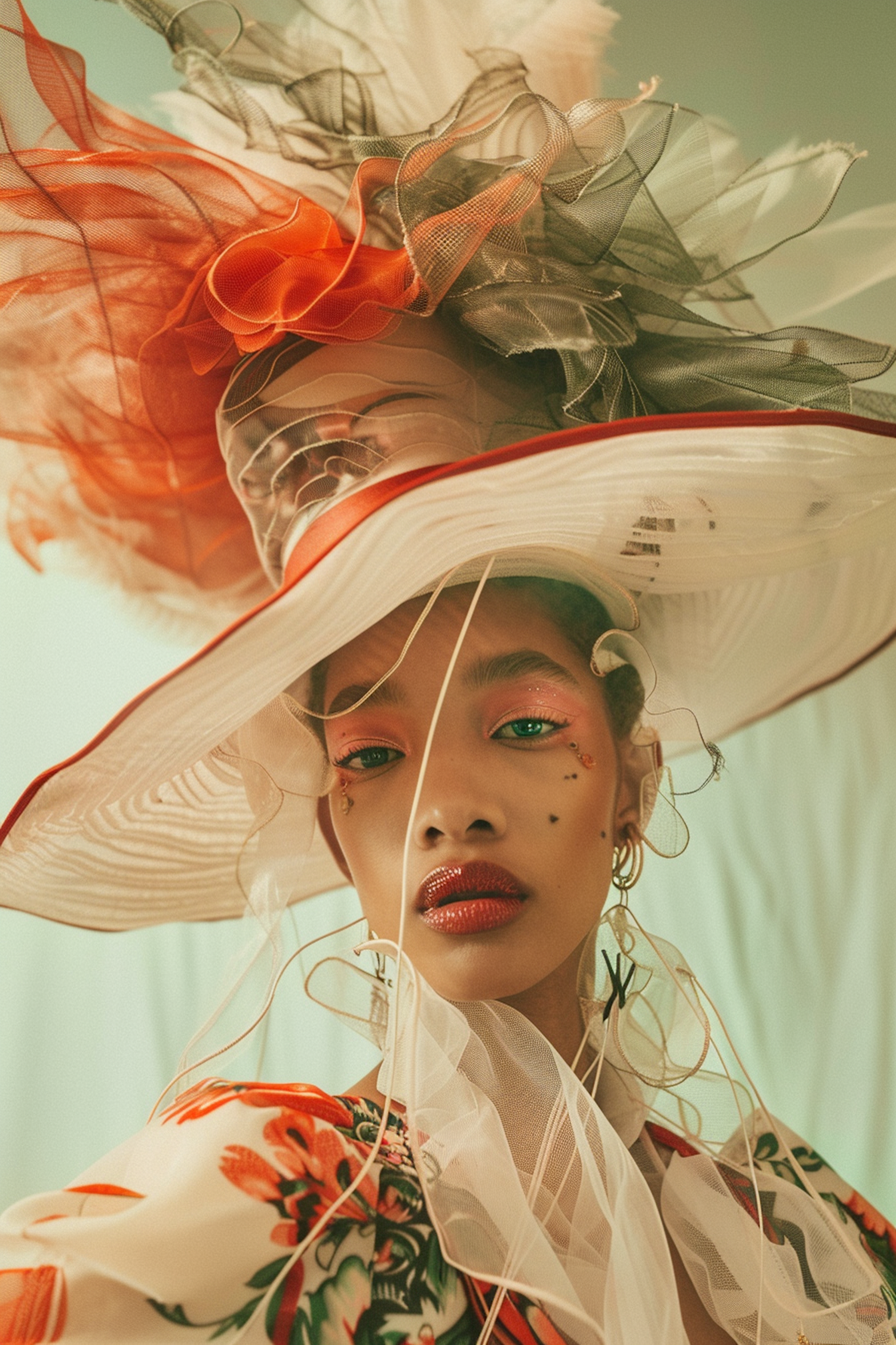 A woman in a vibrant, elaborate hat with sheer layers and bold makeup, featuring green eyes and glossy red lips against a soft green backdrop.