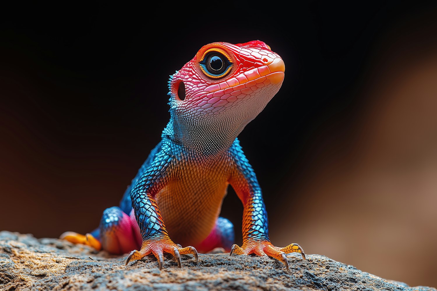 Vibrant lizard with red head and blue body on a rock, showcasing stunning colors and textures against a blurred brown background.