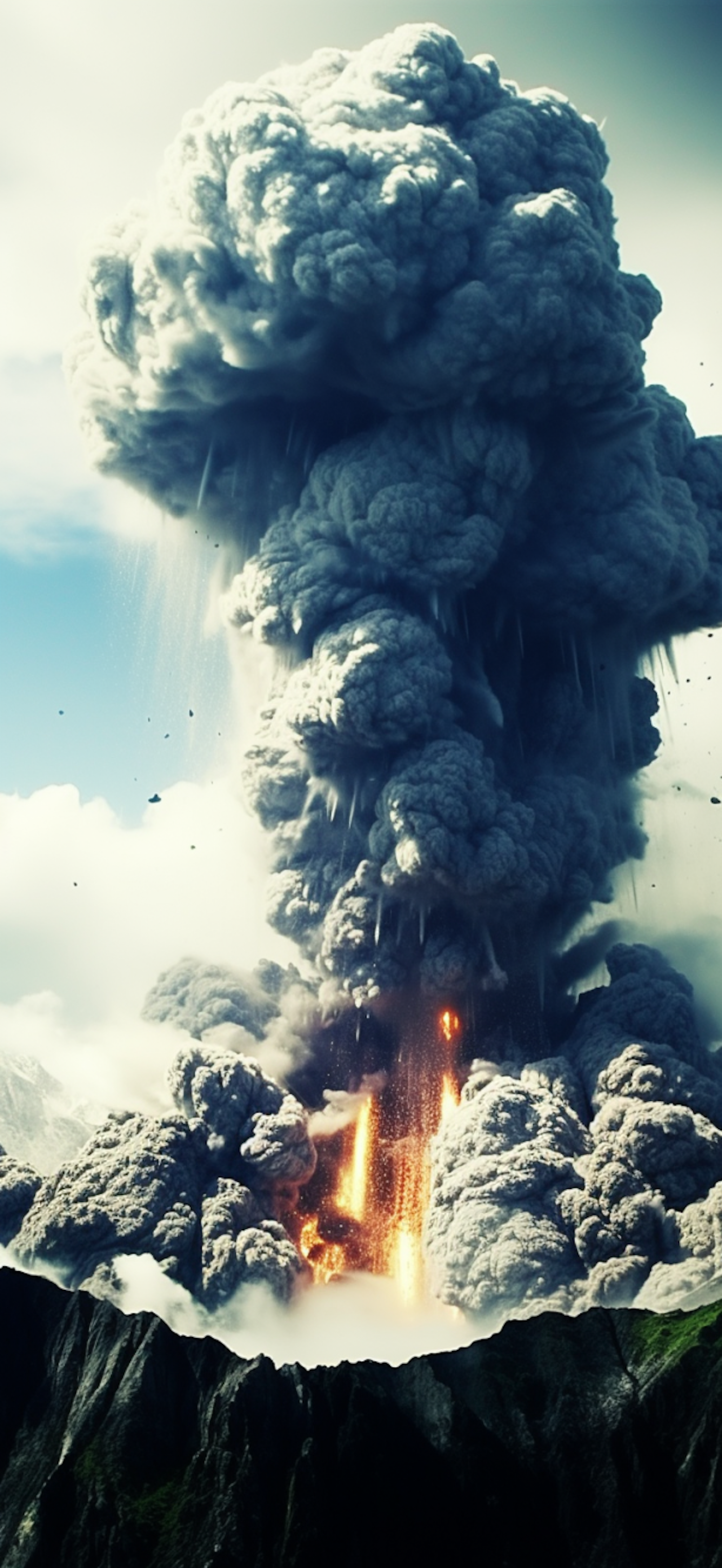Dramatic volcanic eruption with towering ash plume and fiery lava, set against rugged mountains and a blue sky.