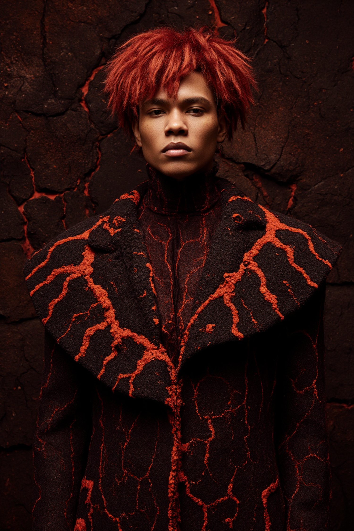 A striking portrait of a person in a lava-inspired outfit with fiery red hair, set against a cracked volcanic rock background.