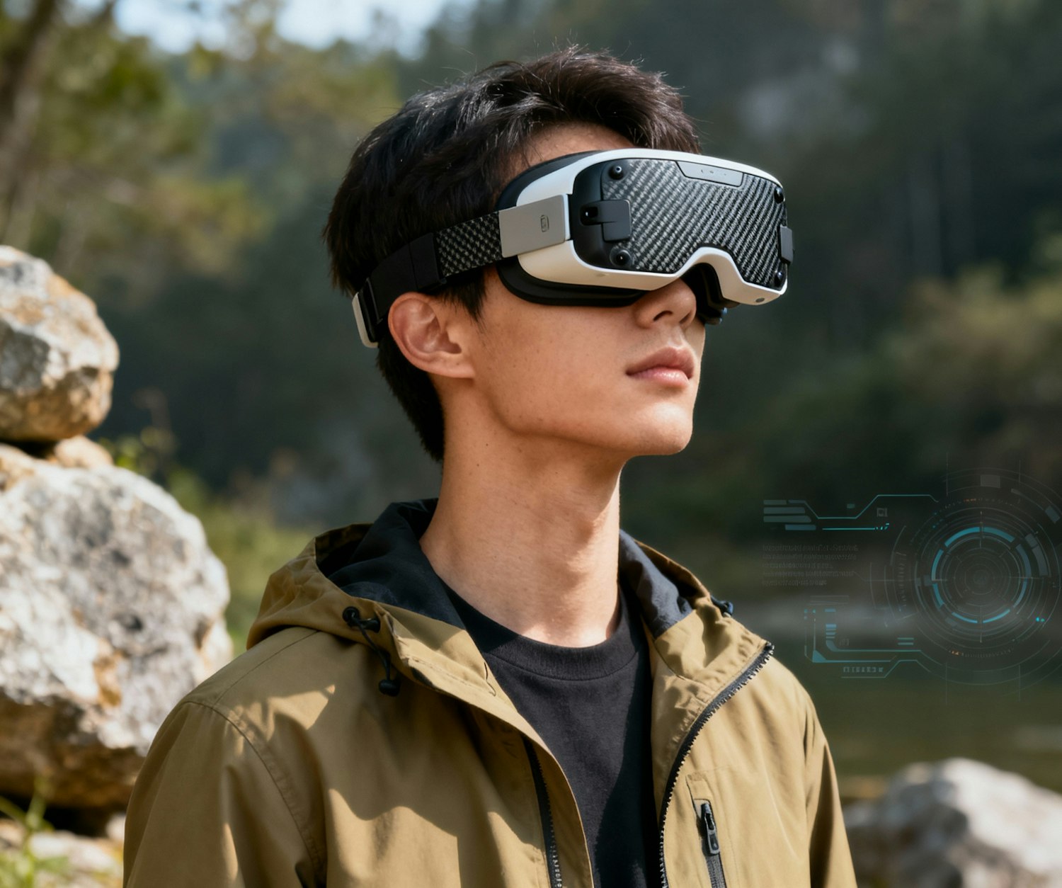 A man outdoors wearing a futuristic VR headset, surrounded by nature, showcasing advanced technology in a serene environment.