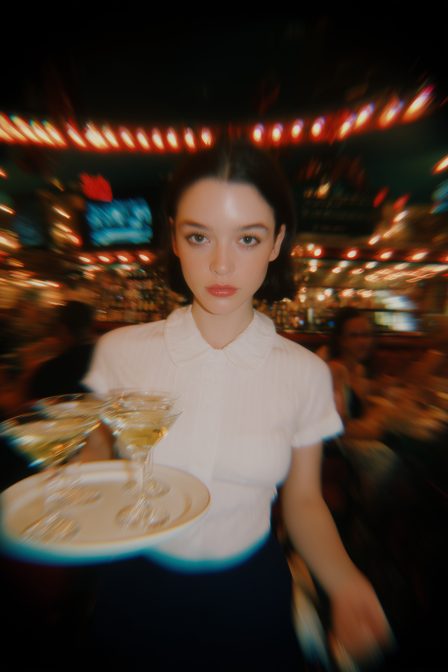 A young woman in a white blouse holds a tray with martini glasses in a warmly lit, bustling bar or restaurant setting.