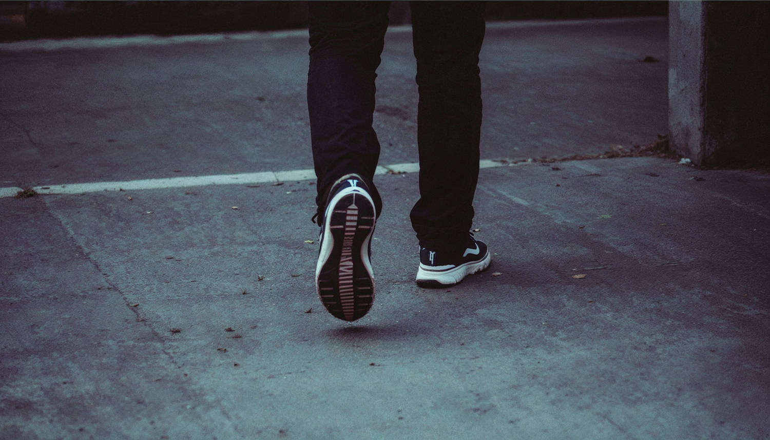 Person walking on concrete in black pants and sneakers, focus on shoe sole. Dim lighting creates a cool, muted atmosphere.