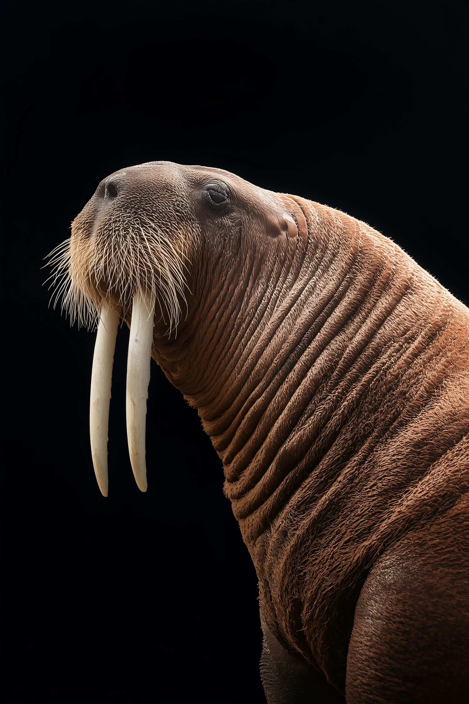 A close-up of a walrus with prominent tusks and textured skin, set against a black background for a striking contrast.