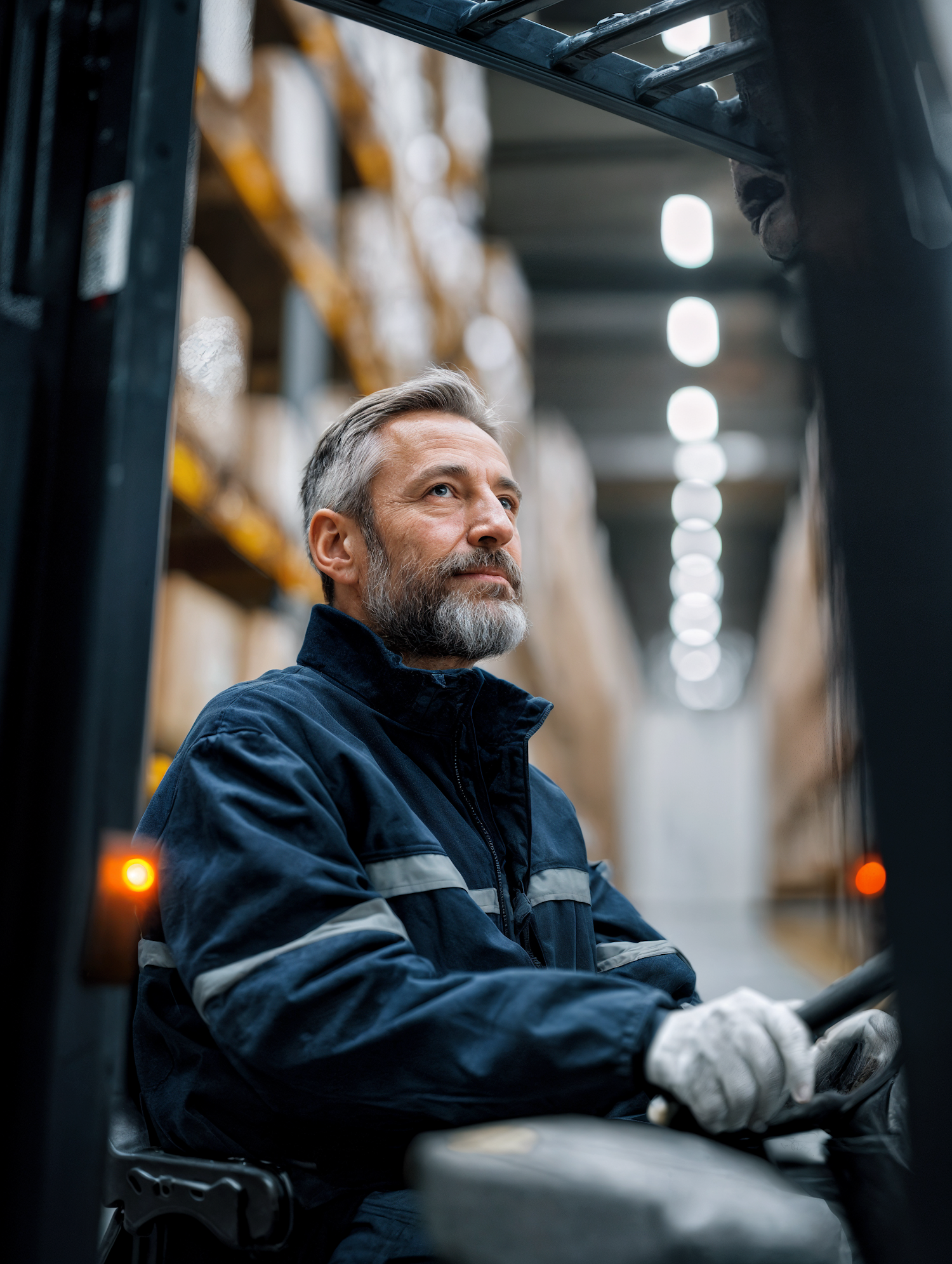 A warehouse worker operating a forklift, focused on his task, surrounded by shelves of goods in a well-lit industrial setting.