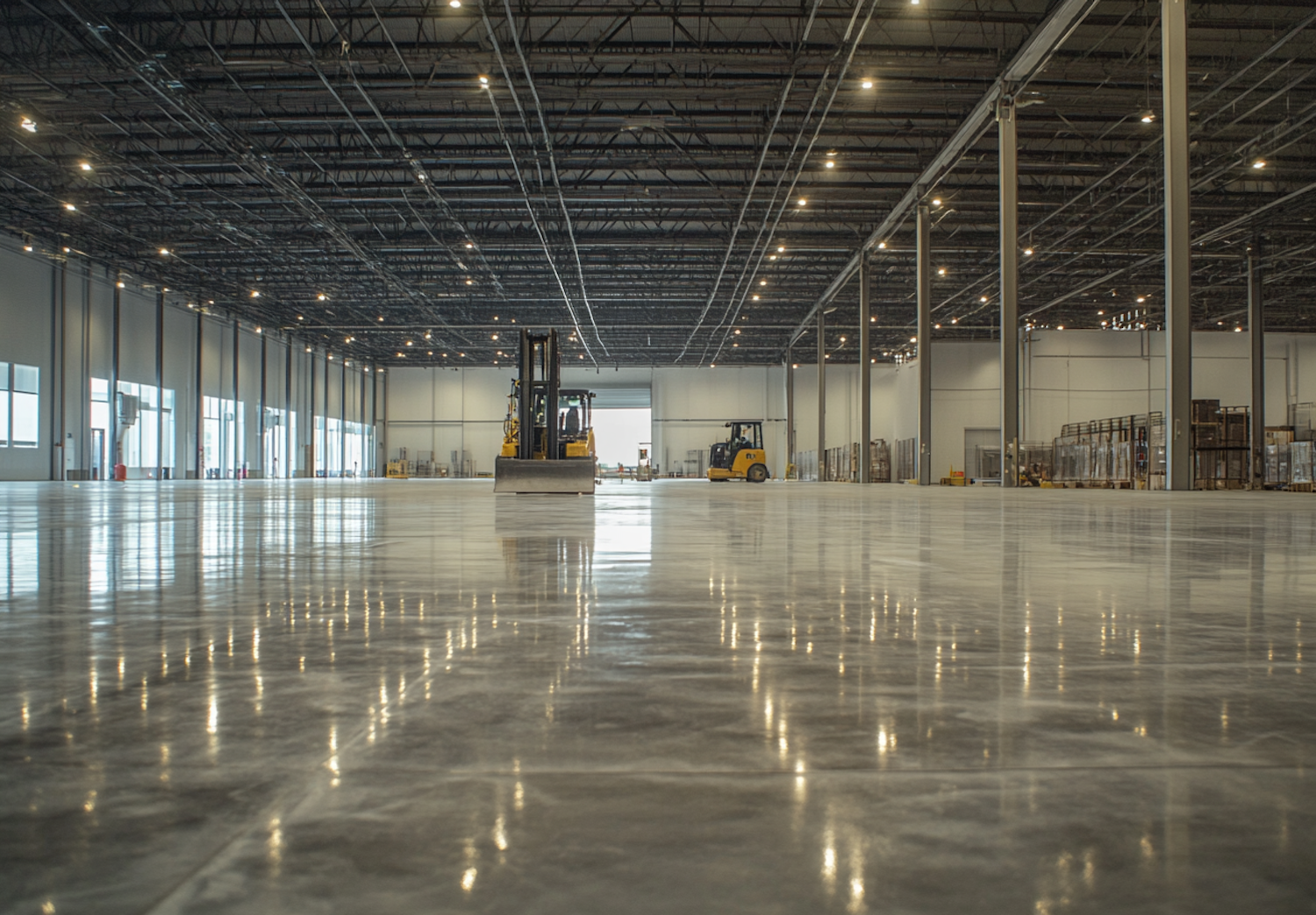 Spacious warehouse interior with polished floors, forklifts, and organized storage. Bright lighting and high ceilings enhance the vastness.