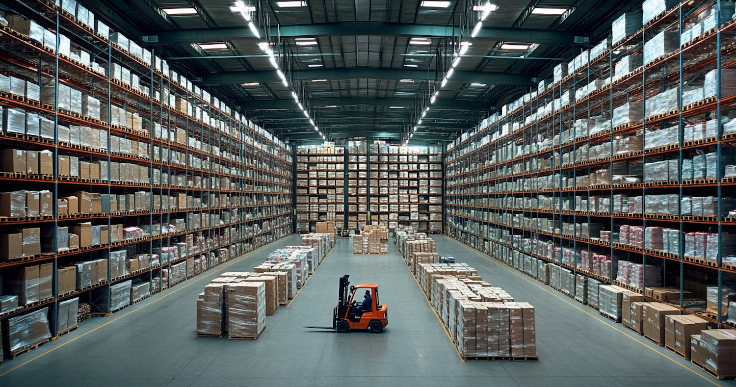 Vast warehouse with towering shelves and an orange forklift in operation, showcasing organized storage and efficient logistics.