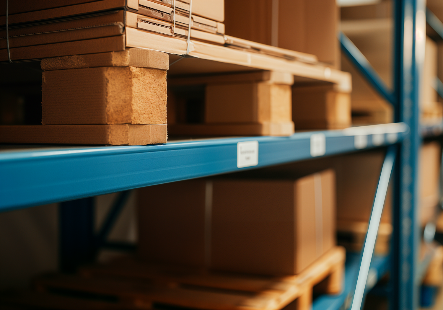 Close-up of warehouse shelves with stacked cardboard boxes and wooden pallets, showcasing organized storage in a warm industrial setting.