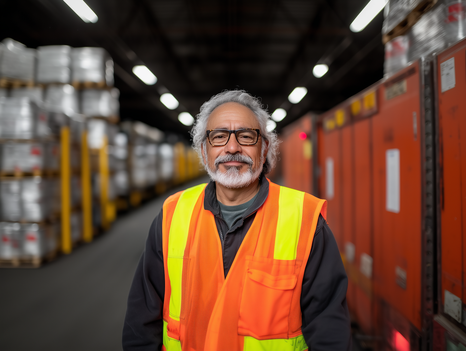 Smiling older man in a warehouse, wearing a bright orange safety vest and glasses, surrounded by industrial storage containers.