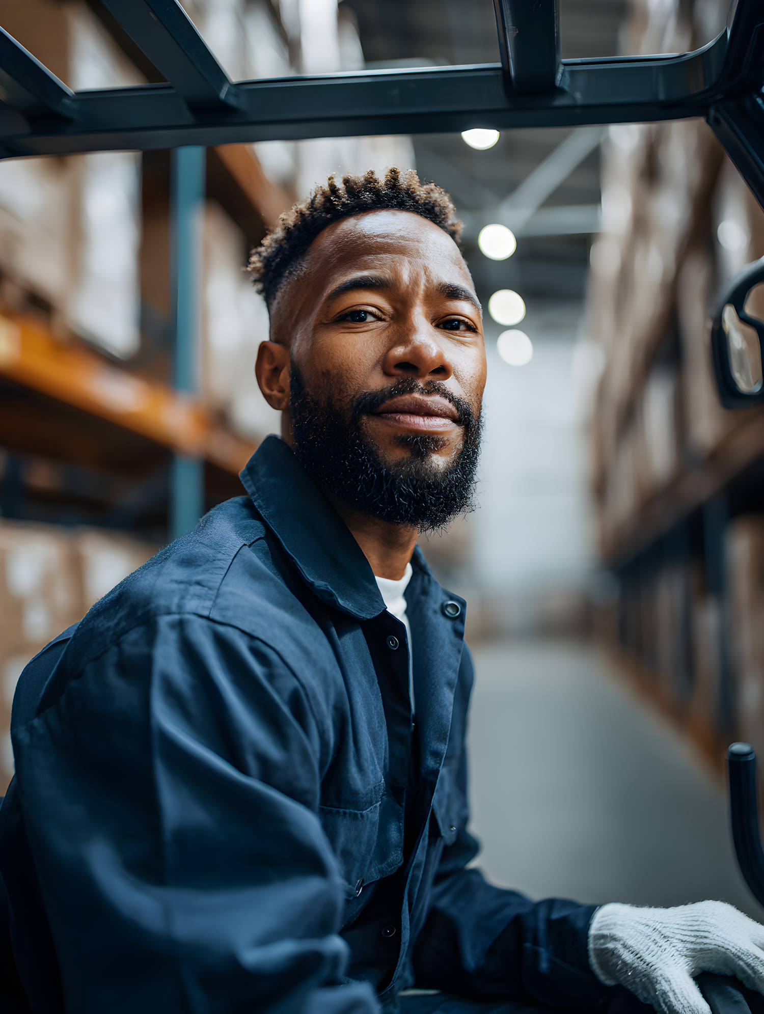 A worker in a warehouse, wearing a blue uniform and gloves, sits confidently amidst shelves of boxes, showcasing a professional environment.