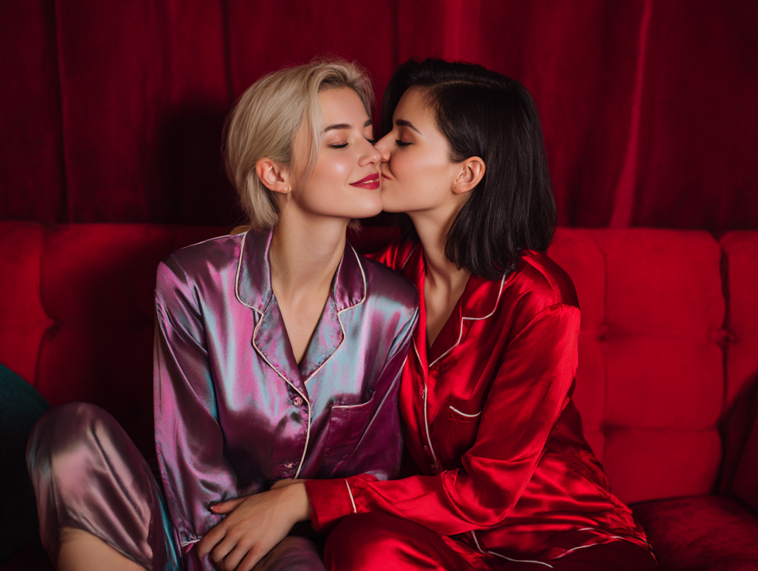 Two people in satin pajamas share a tender moment on a red couch, surrounded by a warm and intimate atmosphere.