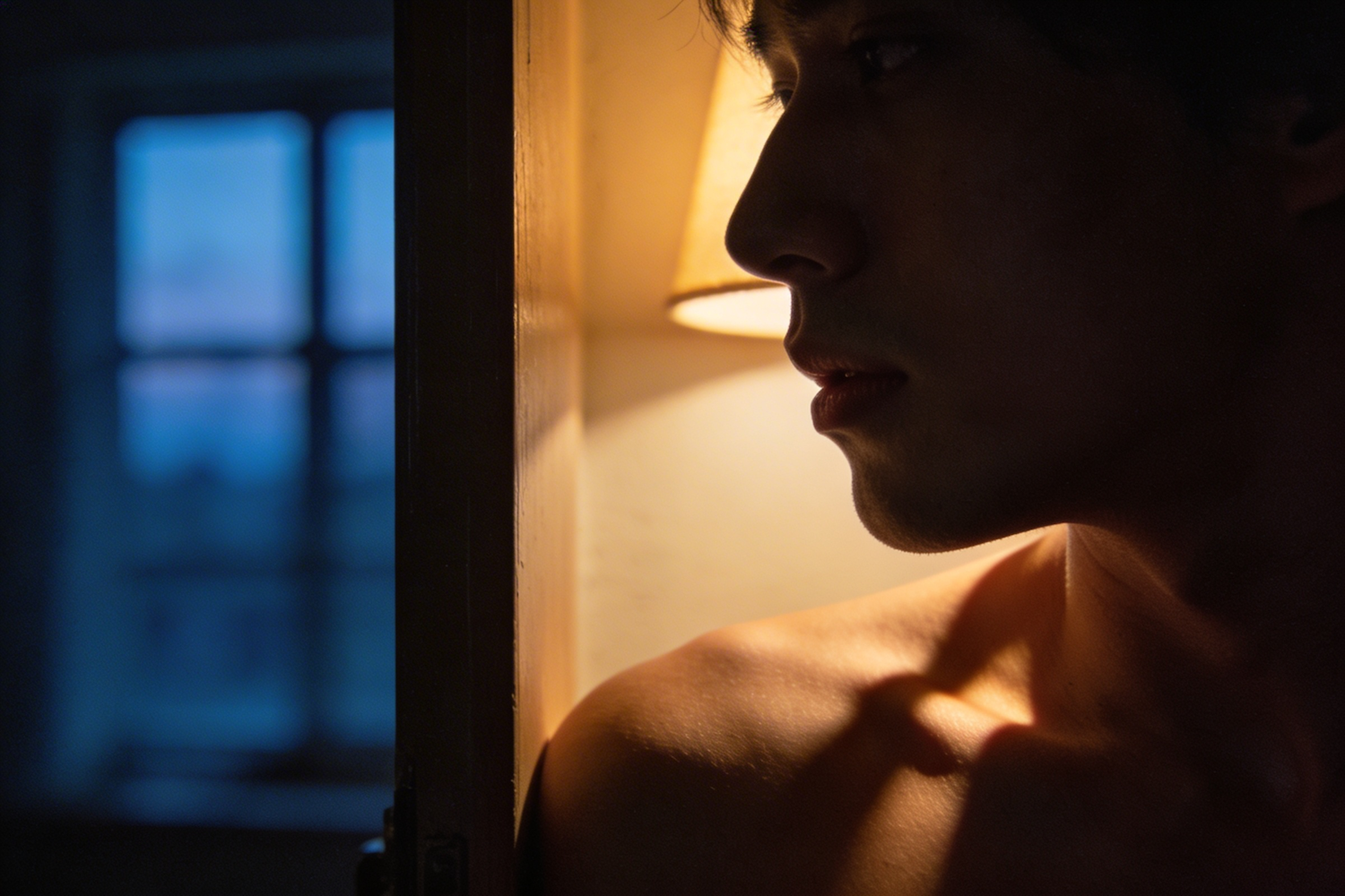figure partially hidden behind a doorway, only shoulder and jawline visible, warm lamplight mixing with cool dusk from outside, guarded yet intimate mood, the sense of a private conversation just ended