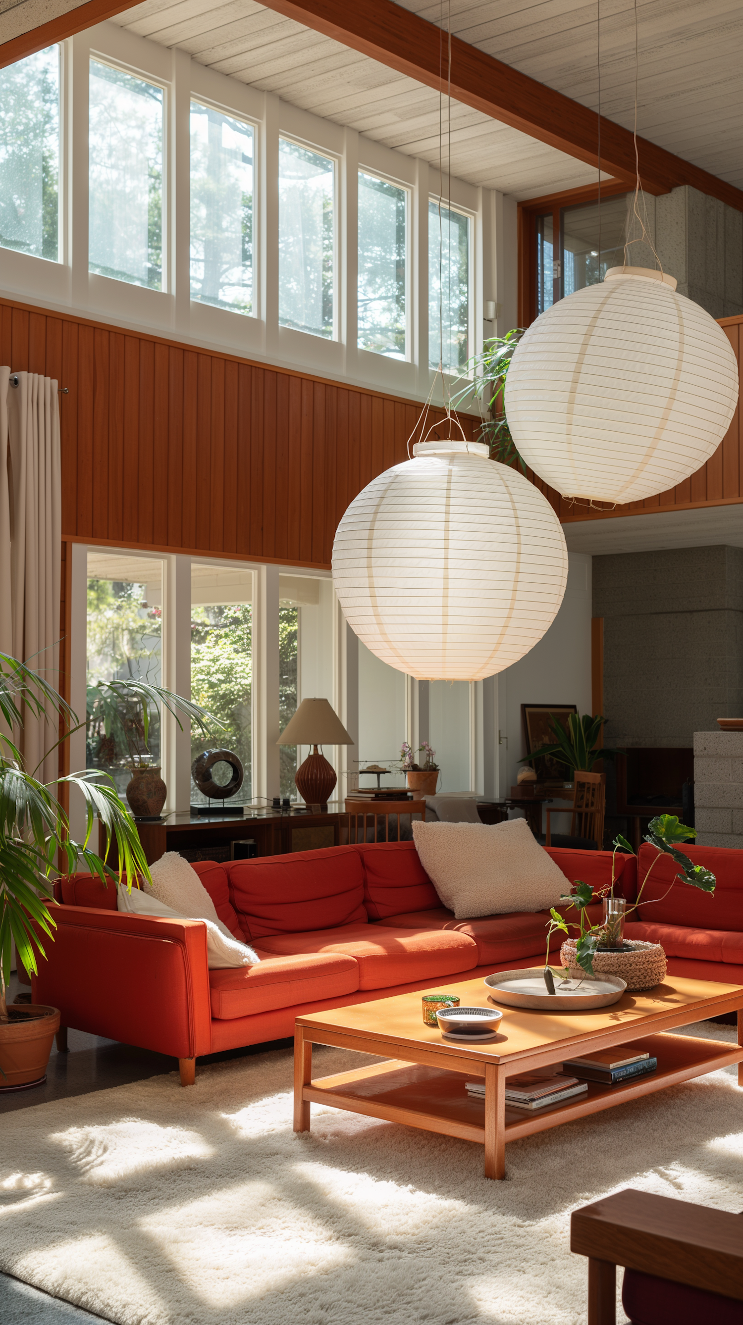 Modern living room with red sofa, paper lanterns, and natural light. Cozy and inviting space with wooden accents and lush greenery.