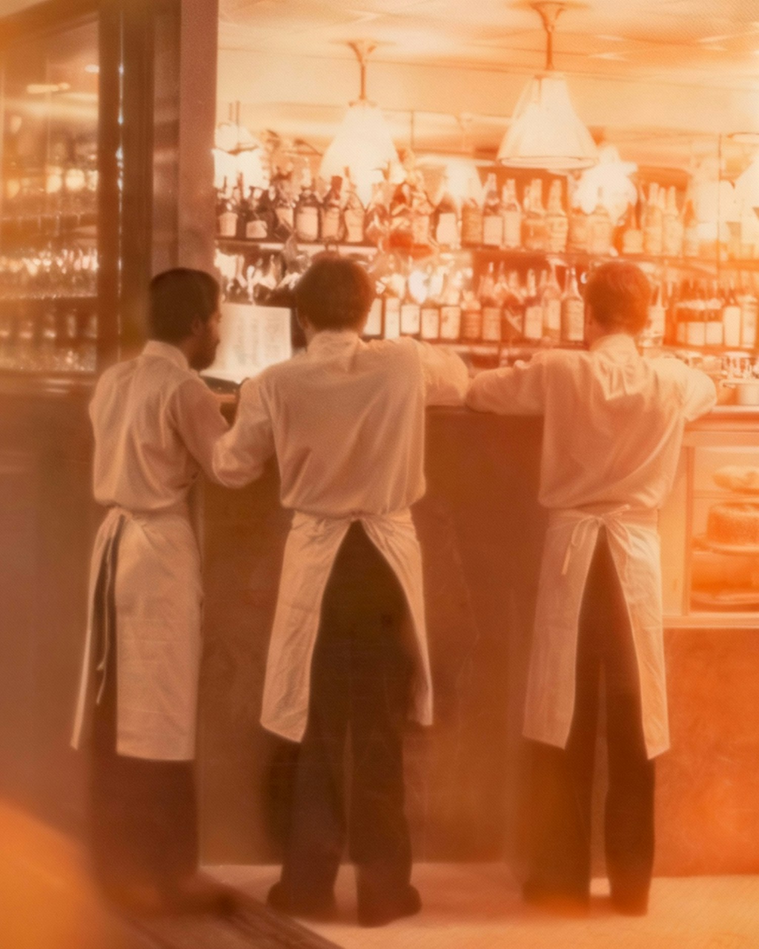 Three staff members in white aprons stand at a warmly lit bar counter, surrounded by shelves of bottles, creating a nostalgic ambiance.