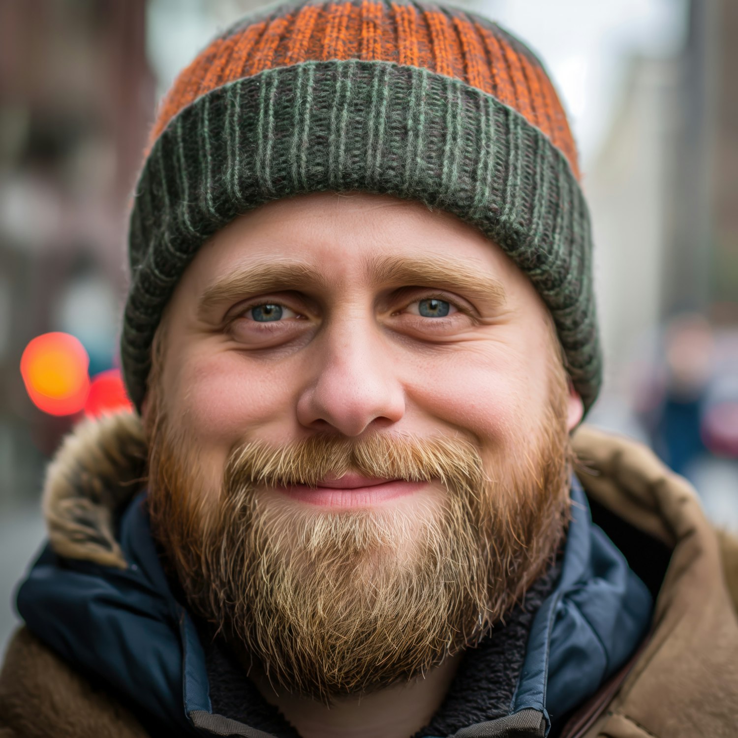 Smiling man with a beard wearing a striped beanie and brown coat in an urban setting. Warm and inviting expression.