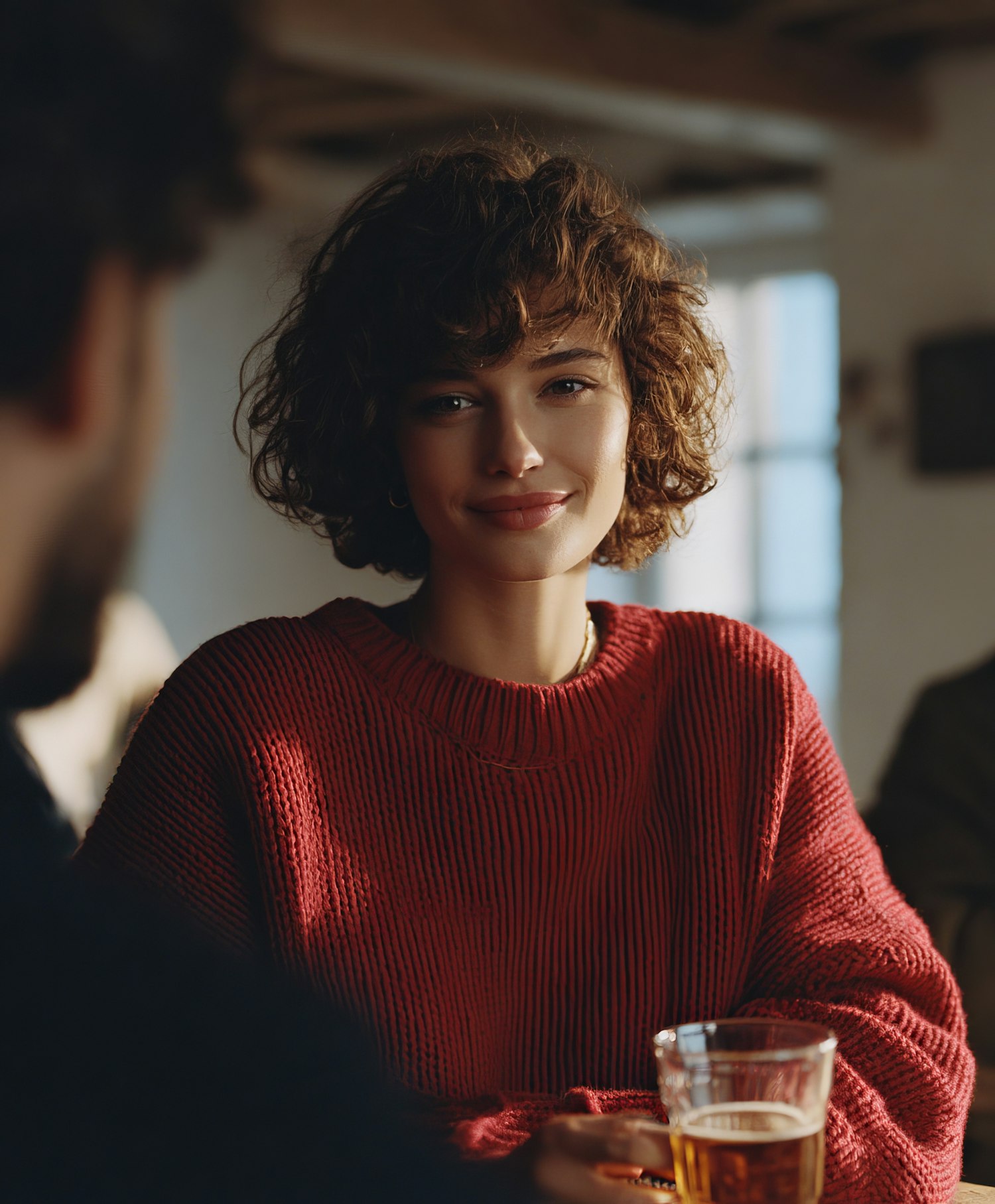 A woman in a red sweater smiles warmly while holding a glass of beer in a cozy indoor setting, engaging in a friendly conversation.